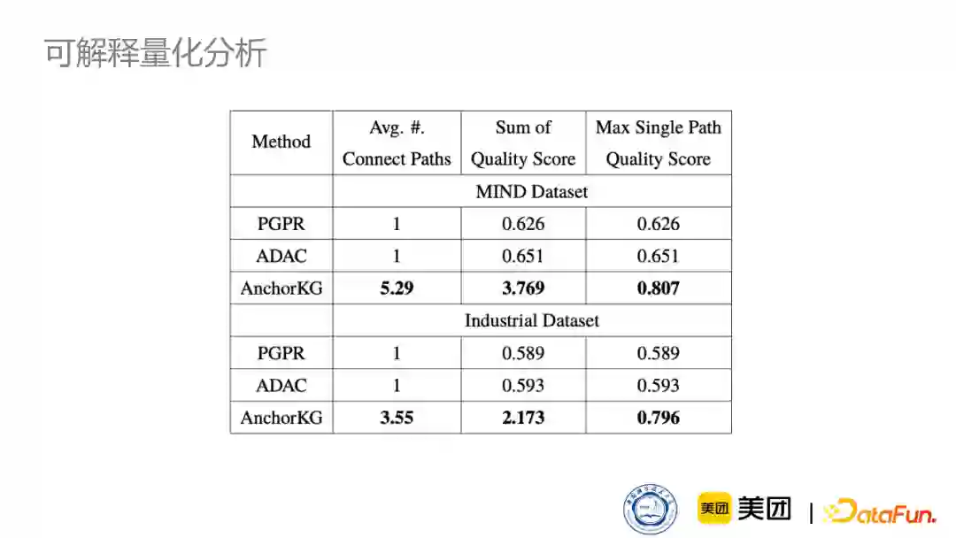 同时我们对可解释性也做了一个量化分析。模型中本就包含RNN模块,所以我们用RNN模块的分数来粗略评估可解释路径的质量,可以看到我们在数量还有质量上都比baseline模型要高。