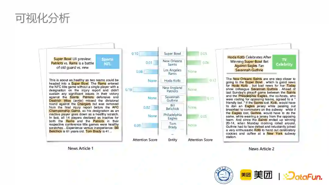 同时我们也做了可视化的分析,下图展示了模型在一篇新闻中最终学到的weight在不同知识实体上的表现。可以看到,对于这篇新闻来说,重要的实体会学习到更高的权重。