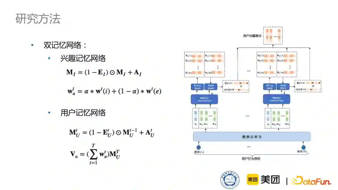 接下来,我又设计了双记忆网络模型来建模用户的多种多样的信息表示。使用记忆网络是因为它有两个非常显著的优势。 * 对于建模序列化信息,它有非常好的优势。记忆网络,顾名思义,相对于GRU或者LSTM来说,具有更强的记忆能力,因此在建模更长的序列信息时,它有更好的学习能力。 * 多槽的构造使它对于学习用户的多兴趣或者多向量表示,有天生的结构优势。