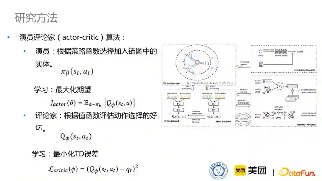 接下来,我们采用演员评论家(actor-critic)算法来训练强化学习网络。演员会根据策略函数,来选择加入锚点知识图中的实体,而我们会通过最大化期望去学习这个演员网络,同时评论家会根据值函数来评估动作选择的好坏。这个过程通过最小化TD error来进行训练。