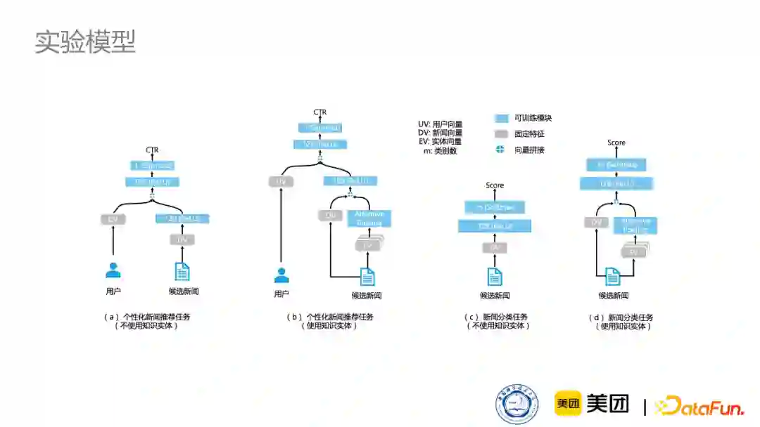为了更直观地验证效果,我们选择了非常简单的模型,仅仅用到了新闻向量和用户向量,再加上通过知识图谱预训练得到的实体向量。其中,我们对比了两种实体向量,分别是通用知识图谱训练出来的实体向量以及新闻知识图谱训练出来的实体向量。如下图所示,在不同的任务上,我们使用了不同的架构。