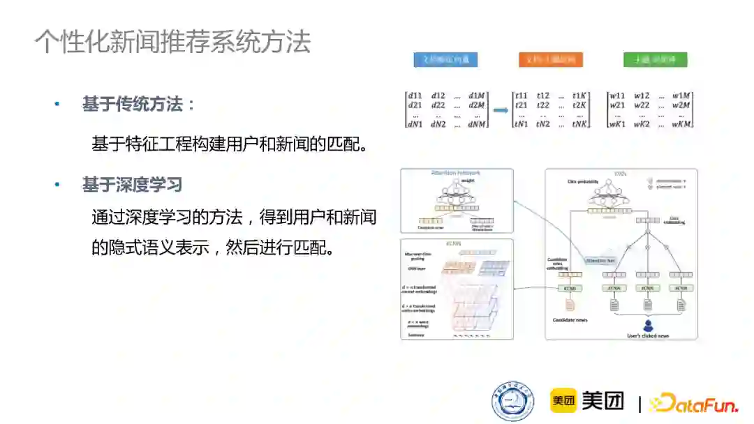 阅读新闻是人们日常生活中必不可少的活动,并且由于新闻阅读逐渐从纸质端转变到电子端,现在大家可以从各种社交平台上进行新闻的阅读。同时,身处信息爆炸的时代,一天可能就有上万篇的新闻文章产生,这样对于用户来说会造成非常严重的信息过载的问题。因此,个性化新闻推荐系统就应运而生,它能有效地提升新闻服务的质量。 个性化新闻推荐系统的构建有两种方法: * 基于传统方法:通过特征工程的方法构建用户和新闻的匹配。比如,将新闻的tf-idf特征和用户之前阅读的新闻的tf-idf特征进行直接匹配。 * 基于深度学习:通过学习用户和新闻的隐式语义表示,在隐向量空间里进行匹配,再对用户进行推荐。