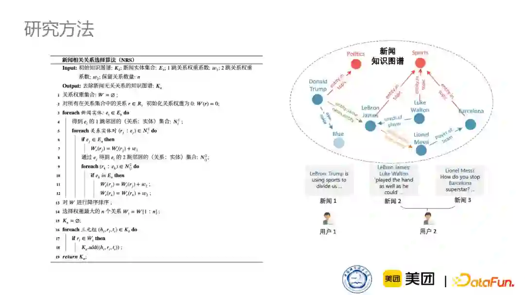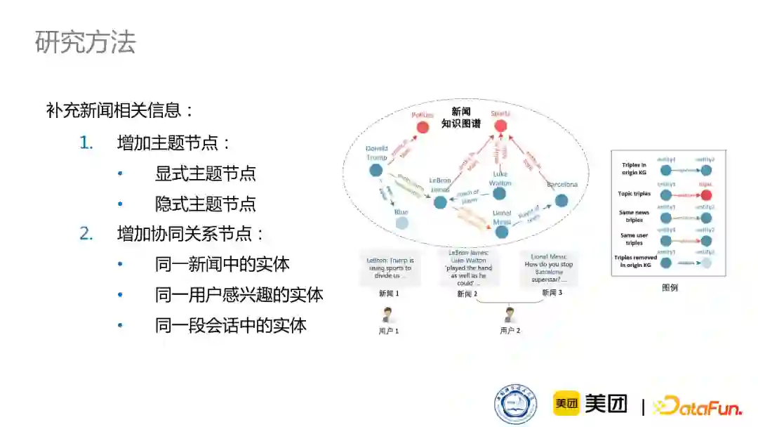 显式主题节点是新闻本身所属的类别,这在编辑中就能体现出来,比如它是体育新闻,是NBA新闻还是足球新闻等等;同时,我们通过LDA topic model也可以对它训练一些隐式的语义节点,作为主题节点增加进来。然后我们通过连接出现在这篇新闻中的实体和主题节点,来构建与新增加的主题相关的三元组。同时,虽然一些新闻实体在知识图谱中没有直接相连,但是它们其实能强烈地体现在新闻阅读习惯中。比如经常出现在同一篇新闻中的实体,或者同一用户感兴趣的实体,这些实体其实反映了用户行为或者新闻本身特征的一个协同关系。举例说明,比如你是个足球迷,你在看到梅西相关新闻的时候,可能也会关注C罗,但是他们在知识图谱中没有直接相连,然后我们通过增加这样的一些连接关系,来丰富新闻领域的知识图谱。