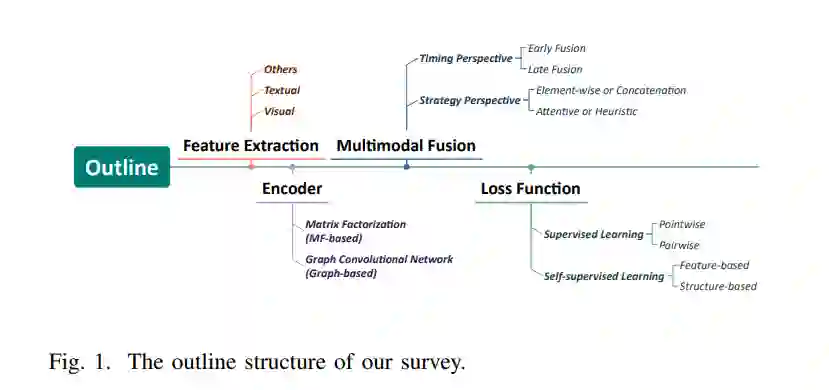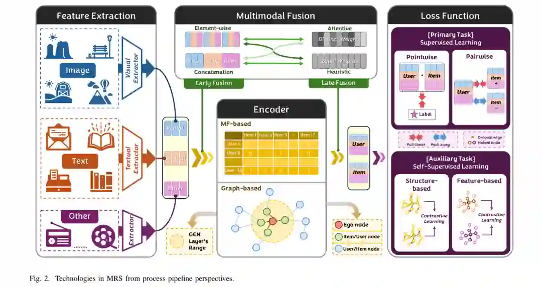 根据当前多模态推荐系统(MRS)的最新研究成果,我们将MRS中的技术总结并组织为四个部分,如图2所示。具体而言,这四个部分分别是:特征提取、编码器、多模态融合和损失函数。我们将简要概述这些部分,并在后续章节中详细讨论。 A. 特征提取