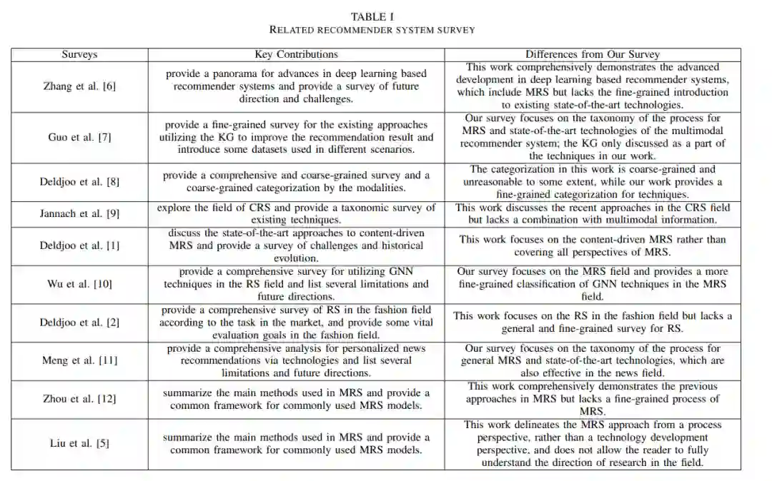 此前已经有一些关于推荐系统的综述,涉及这些系统的一般方面或特定的部分内容。然而,没有任何综述提供对近年来的SOTA MRS工作中所使用的过程和技术的全面合理的分类,这正是当前该领域亟需的。MRS的目标是通过将多模态信息引入推荐系统,增强提取用户与项目之间更深层次、更准确交互的能力。本文讨论了现有相关综述的主要贡献和局限性,并突出了我们工作中的独特贡献,如表 I 所示。 Zhang 等人[6]提供了基于深度学习的推荐系统进展的全景视图,调查了未来的方向和挑战,包括联合表示学习、可解释性、更深的模型和机器推理。然而,他们的工作缺乏对现有SOTA技术的细粒度介绍。Deldjoo 等人[8]提供了一个综合性综述,并按模态进行了粗粒度分类,包括音频、视觉和文本等常见特征,以及运动、元数据和语义取向等特殊特征。然而,这一分类较为粗略,缺乏精确性。 Jannach 等人[9]探讨了对话式推荐系统(CRS)的领域,提供了现有技术的分类综述,但其工作未整合多模态信息。Deldjoo 等人[1]讨论了基于内容的MRS的SOTA方法,调查了挑战和历史演变,包括增加推荐多样性和新颖性、提供透明性和解释、实现上下文感知、提高可扩展性和效率,以及缓解冷启动问题。然而,他们的重点主要放在基于内容的MRS上,而非涵盖整个MRS领域。 之前的工作[7],[10]集中于推荐系统中的图结构。Guo 等人[7]提供了一个细粒度的综述,分析了利用知识图谱(KG)来增强推荐结果的方法,将方法分为基于嵌入的、基于路径的和统一的。Wu 等人[10]提供了关于图神经网络(GNN)技术在推荐系统中的综合性综述,指出了多个限制和未来的方向,包括多样性和不确定性表示、可扩展性、动态性、感受野、自监督学习、鲁棒性、隐私保护方法和公平性。 Deldjoo 等人[2]提供了一个关于时尚领域推荐系统的全面综述,分类了市场中的任务,并概述了时尚领域特有的评估目标。Meng 等人[11]对个性化新闻推荐进行了深入分析,讨论了技术,并列出了多个局限性和未来方向,包括隐私保护、假新闻缓解和去偏见。Zhou 等人[12]总结了MRS中所采用的主要方法,并提出了一个通用框架,用于常见的MRS模型。尽管他们的工作提供了对以往方法的全面回顾,但他们提出的MRS管道缺乏详细阐述。最近,Liu 等人[5]也总结了MRS中使用的主要方法,并提供了一个常见框架。然而,这项工作从过程的角度划分MRS,而不是专注于技术发展,这限制了读者对该领域研究方向的全面理解。 总之,我们的工作旨在填补这些空白,提供一个更加详细和最新的MRS过程和技术分类,从而推动对这个快速发展的领域的理解和发展。 我们的调研专注于从技术角度对MRS进行精细分类,以为研究人员提供有关MRS技术发展的见解。最后,我们讨论了多模态推荐系统发展的潜在未来方向。 C. 本综述的大纲
