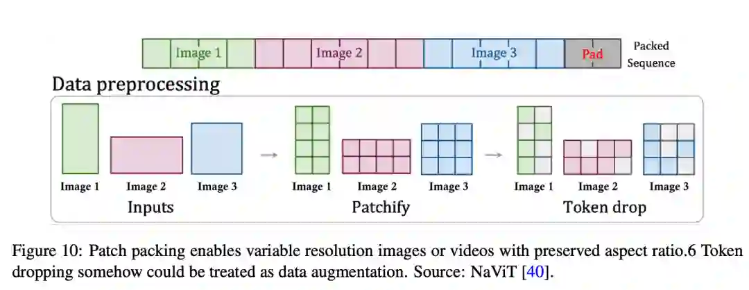 根据 Sora 的技术报告和相应的参考文献,patch n' pack(PNP)很可能是一种解决方案。如图 10 所示,PNP 将来自不同图像的多个 patch 打包在一个序列中。这种方法的灵感来源于自然语言处理中使用的样本打包,它通过丢弃 token 来实现对不同长度输入的高效训练。在这里,patch 化和 token 嵌入步骤需要在压缩网络中完成,但 Sora 可能会像 Diffusion Transformer(扩散 Transformer)那样,为 Transformer token 进一步 patch 化。