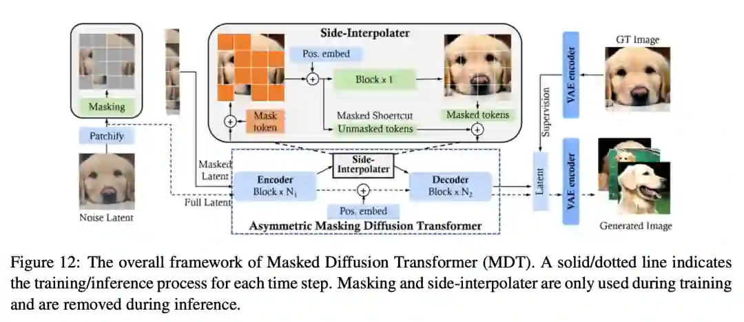 与掩蔽自编码器(MAE)一样,掩蔽扩散 Transformer(MDT)也在扩散过程中加入了掩码潜在模型,以明确增强图像合成中对象语义部分之间的上下文关系学习。