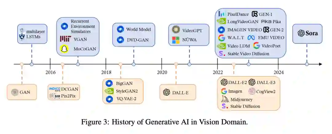 如图 3 所示,在过去十年中,视觉类的生成模型经历了多样化的发展路线。