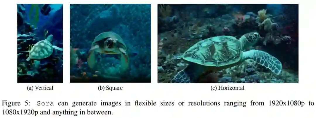 Sora 的一个显著特征是它能够训练、理解和生成原始尺寸的视频和图像,如图 5 所示。而传统方法通常会调整视频大小、裁剪或调整视频的长宽比以适应统一的视频和图像。利用扩散 Transformer 架构,Sora 是第一个拥抱视觉数据多样性的模型,可以以多种视频和图像格式进行采样,范围从宽屏 1920x1080p 视频到垂直 1080x1920p 视频以及介于两者之间的视频,而不影响其原始尺寸。
