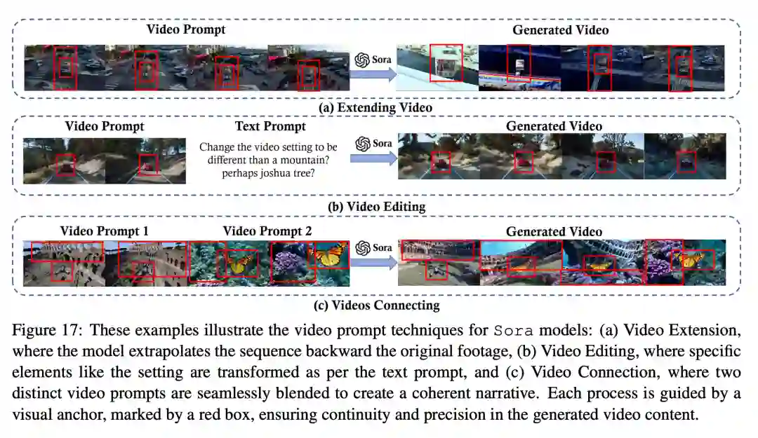 Sora 的提示涵盖了广泛的场景。近期的作品(如 VoP、Make-A-Video 和 Tune-A-Video)展示了提示工程如何利用模型的自然语言理解能力来解码复杂指令,并将其呈现为连贯、生动和高质量的视频叙事。