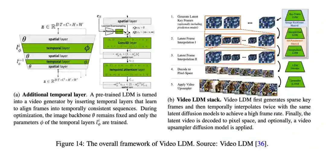Blattmann et al. 建议将二维潜在扩散模型转化为视频潜在扩散模型(Video LDM)。为此,他们在 U-Net 主干网和 VAE 解码器的现有空间层中添加了一些临时时间层,以学习如何对齐单个帧。这些时间层在编码视频数据上进行训练,而空间层则保持固定,从而使模型能够利用大型图像数据集进行预训练。LDM 的解码器可进行微调,以实现像素空间的时间一致性和时间对齐扩散模型上采样器,从而提高空间分辨率。