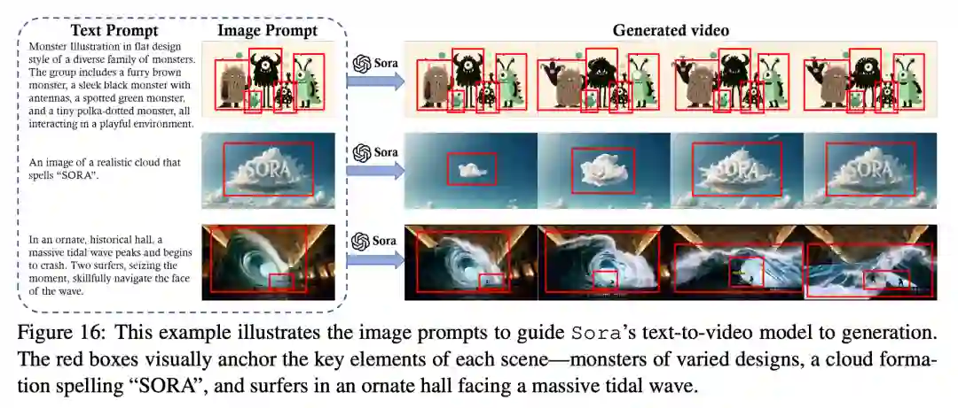 图 16 展示了人工智能生成的视频:「一只头戴贝雷帽、身穿高领毛衣的柴犬」、「一个独特的怪物家族」、「一朵云组成了 SORA 一词」以及「冲浪者在一座历史悠久的大厅内驾驭潮汐」。这些例子展示了通过 DALL・E 生成的图像提示 Sora 可以实现哪些功能。