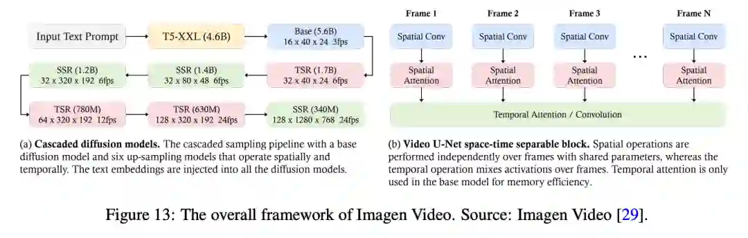 如图 13 所示,首先,冻结的 T5 文本编码器会根据输入的文本提示生成上下文嵌入。这些嵌入对于将生成的视频与文本提示对齐至关重要,除了基础模型外,它们还被注入级联中的所有模型。随后,嵌入信息被注入基础模型,用于生成低分辨率视频,然后由级联扩散模型对其进行细化以提高分辨率。基础视频和超分辨率模型采用时空可分离的 3D U-Net 架构。该架构将时间注意力层和卷积层与空间对应层结合在一起,以有效捕捉帧间依赖关系。它采用 v 预测参数化来实现数值稳定性和条件增强,以促进跨模型的并行训练。