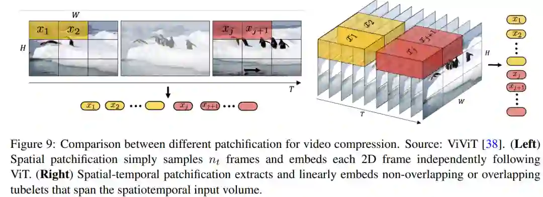 空间 patch 压缩:涉及将视频帧转换为固定大小的 patch,类似于 ViT 和 MAE 中使用的方法(见图 8),然后将其编码到潜在空间中,这种方法对于适应不同分辨率和宽高比的视频特别有效。随后,将这些空间 token 按时间序列组织在一起,以创建时间 - 空间潜在表征。