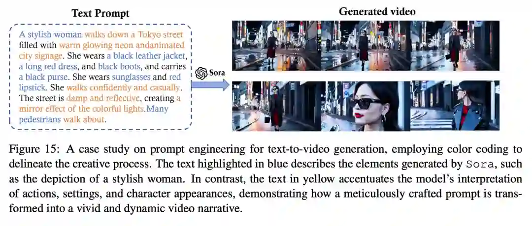 如图 15 所示,「一个时髦的女人走在霓虹灯闪烁的东京街头...... 」就是这样一个精心制作的文本提示,它确保 Sora 生成的视频与预期的视觉效果非常吻合。提示工程的质量取决于对词语的精心选择、所提供细节的具体性以及对其对模型输出影响的理解。例如,图 15 中的提示详细说明了动作、设置、角色出场,甚至是所期望的场景情绪和氛围。