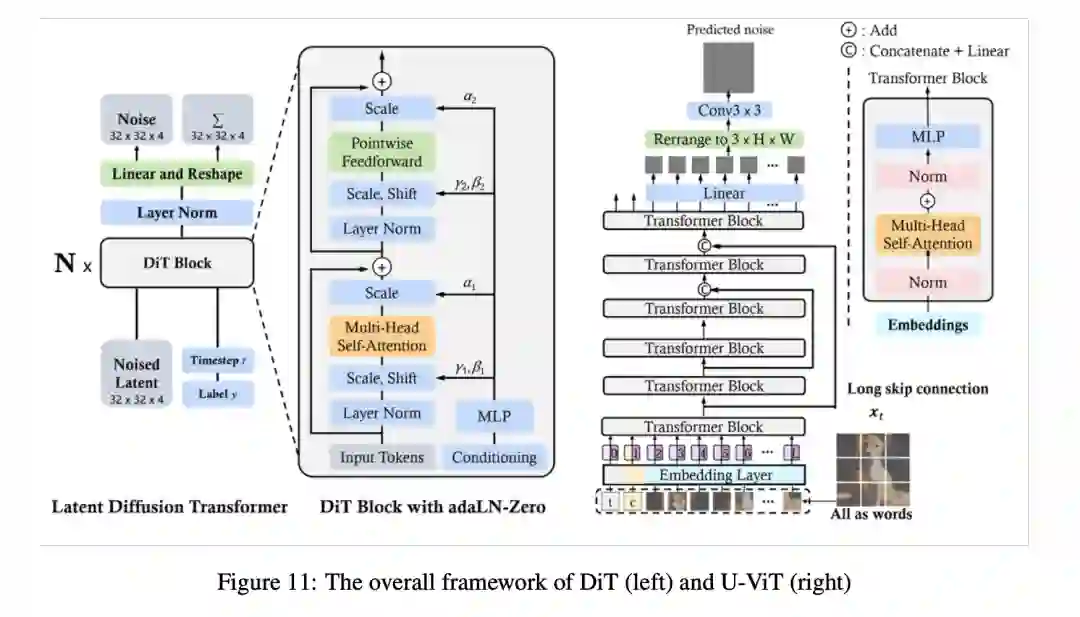 通过采用更灵活的 Transformer 架构,基于 Transformer 的扩散模型可以使用更多的训练数据和更大的模型参数。沿着这一思路,DiT 和 U-ViT 是第一批将视觉 Transformer 用于潜在扩散模型的作品。