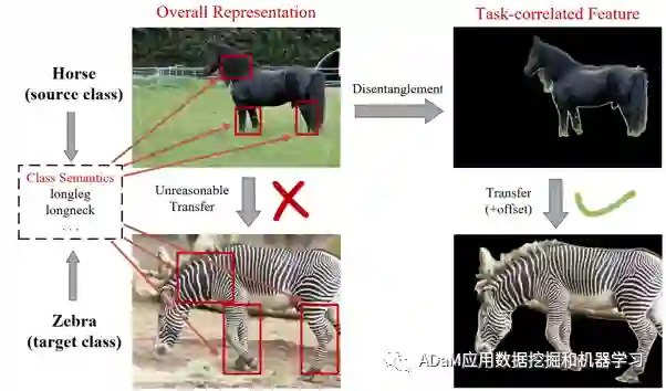在广义零样本(Generalized Zero-shot Learning,GZSL)问题中,由于其可见类与不可见类的类别相互独立的特性,域偏移问题[1]是研究者面临的主要问题之一。而伪样本生成是目前提升模型在GZSL问题中的性能的最有效的方式。但是这类方式仍然存在以下两个问题:(1)特征混淆. 目前基于整体视觉特征(基于预训练好的CNN网络提取的2048D的高级特征)的GZSL模型中,其视觉特征所包含信息的丰富程度远大于属性语义特征,因此直接构建两者之间的映射并进一步合成伪样本并不符合人类一致认知,虽然有相关工作[2, 3]进行了视觉特征的解耦,但它们采用了生成式模型的方式,难以基于有限的可见类样本去保证有效的解耦和生成。(2)分布不明确. 已有GZSL模型尤其是生成式模型需要大量数据去拟合真实数据的分布,并且生成的伪样本分布是不明确的,这会导致在可见类样本数量有限时,模型表现不佳。