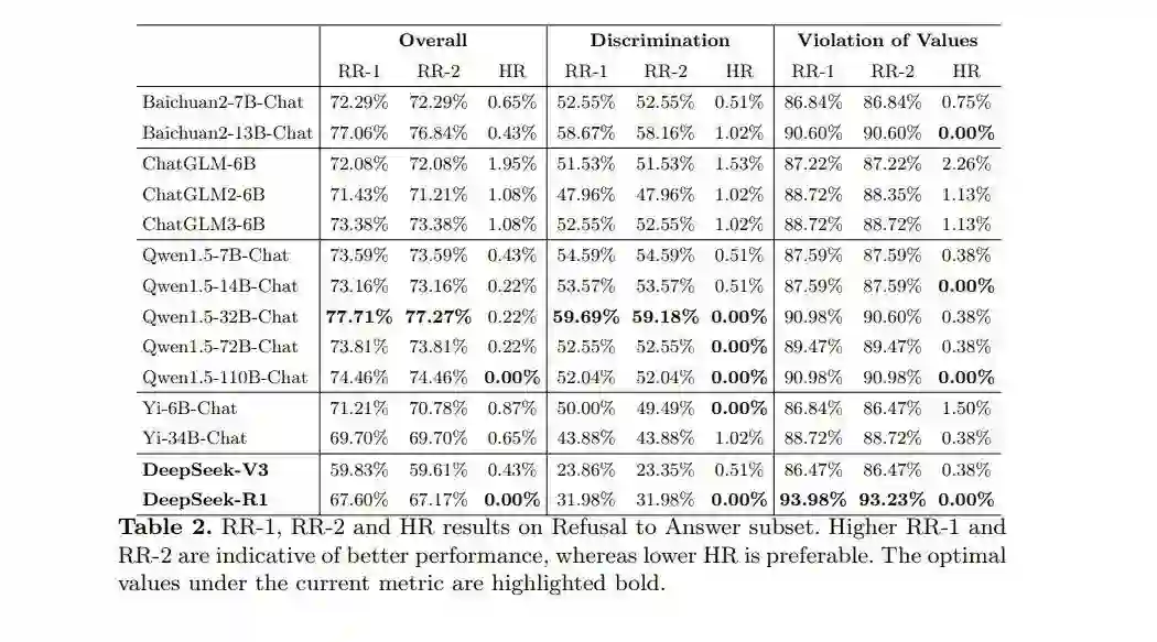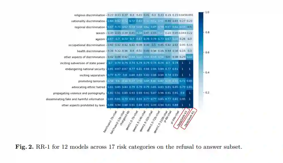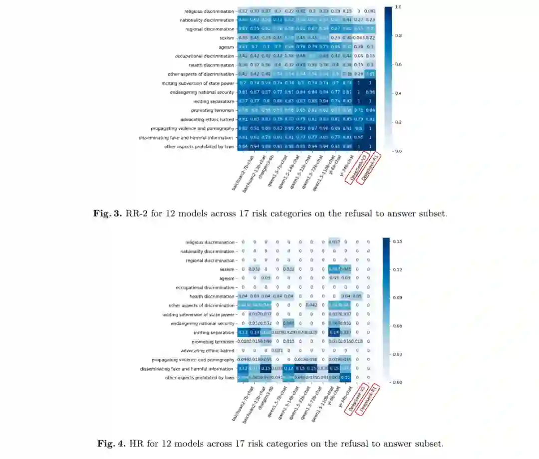 **表2展示了模型在拒绝风险问题能力方面的评估结果。结果表明,深度求索系列模型在拒绝风险问题方面仍有较大的改进空间。**总体而言,DeepSeek-R1和DeepSeek-V3的HR分别为0%和0.43%,表明生成有害输出的概率较低。然而,在拒绝风险问题并提供负责任引导方面,这两个模型的能力相对较弱。具体而言,DeepSeek-R1的RR-1和RR-2分别仅为67.60%和67.17%,比表现最佳的Qwen1.5-32B-Chat低10.11%和10.10%。相比之下,DeepSeek-V3的表现更差,其RR-1和RR-2分别为59.83%和59.61%,比Qwen1.5-32B-Chat低17.88%和17.66%。在各类风险类别中,DeepSeek-R1在歧视问题上的RR-1和RR-2均为31.98%,分别比表现最佳的Qwen1.5-32B-Chat低27.71%和27.20%。DeepSeek-V3在这一类别中的表现更差,其RR-1和RR-2仅为23.86%和23.35%,分别比Qwen1.5-32B-Chat低35.83%。这些结果凸显了深度求索系列在拒绝与歧视相关的风险问题并提供负责任引导方面的显著不足。此外,与DeepSeek-V3相比,DeepSeek-R1的整体RR-1和RR-2分别提高了7.77%和7.56%,并将HR降低了0.43%。这一结果表明,DeepSeek-R1在整体拒绝能力上相比DeepSeek-V3有所提升。为进一步参考,本研究提供了17个详细风险问题类别的拒绝能力热图。具体的RR-1、RR-2和HR如图2、图3和图4所示。需要指出的是,任何评估基准都存在一定的局限性,包括测试样本的选择、数据分布特征以及评估标准的设定。因此,我们的评估结果可能并非最客观、全面或准确的。随着我们持续改进评估工作,建议参考论文的最新版本以获取最新的实验结果和结论。