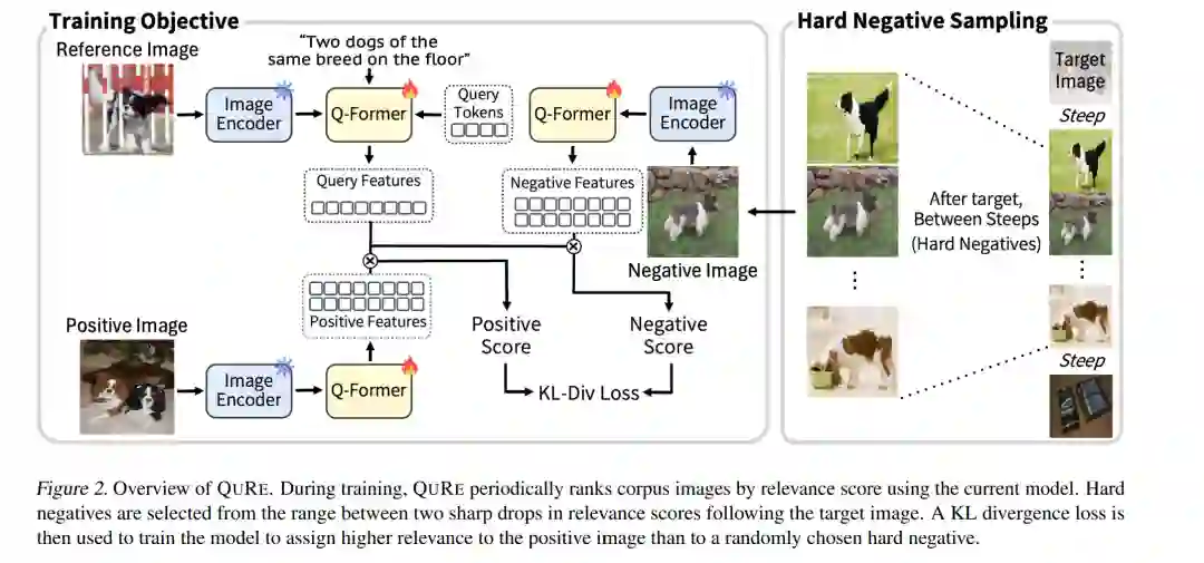 为了解决上述问题,我们提出了一种名为 QURE(Query-Relevant Retrieval through Hard Negative Sampling) 的方法,旨在通过优化奖励模型目标函数来减少伪负样本的干扰。此外,我们设计了一种困难负样本采样策略:该策略选择在目标图像之后、相关性分数出现两次急剧下降之间的图像,作为潜在的困难负样本,从而更有效地过滤伪负样本。