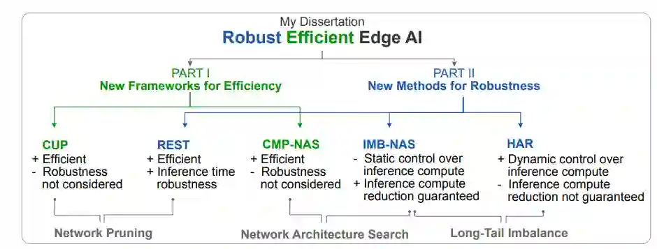(2)鲁棒边缘AI新方法。开发了在降低推理成本同时增强现实噪声鲁棒性的技术。REST框架扩展剪枝应用范围,使网络效率提升9倍、运行速度加快6倍,且具备对抗高斯噪声与对抗样本的鲁棒性;HAR方法将多分支神经网络的早期退出机制扩展至训练阶段,在类别不平衡最优精度,同时节省20%推理算力;IMB-NAS框架通过超网络适配策略优化不平衡数据集的神经架构,相较从头搜索节省5倍计算资源。