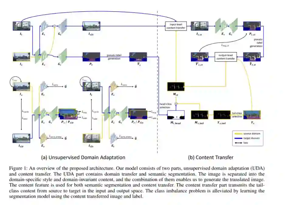 在本文中,我们提出了一种用于语义分割的无监督域自适应算法,该算法的目标是利用有标记的合成数据来分割无标记的真实数据。UDA语义分割的主要问题在于缩小真实图像与合成图像之间的域差距。为了解决这个问题,我们将重点放在将图像中的信息分离为内容和样式。在这里,只有内容具有进行语义分割的线索,而风格造成了领域差距。因此,即使在使用合成数据进行学习时,也可以将图像中的内容和风格进行精确的分离,起到监督真实数据的作用。为了充分利用这种效果,我们提出采用零损失模式。尽管我们在实域上很好地提取了用于语义分割的内容,但在语义分类器中仍然存在类别不平衡的问题。我们通过将尾部类的内容从合成域转移到实域来解决这个问题。实验结果表明,该方法在两种主要的神经网络环境下都取得了最先进的语义分割性能。