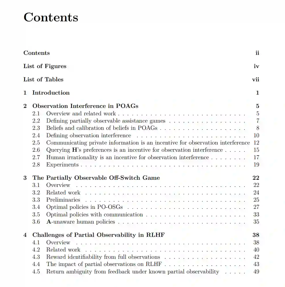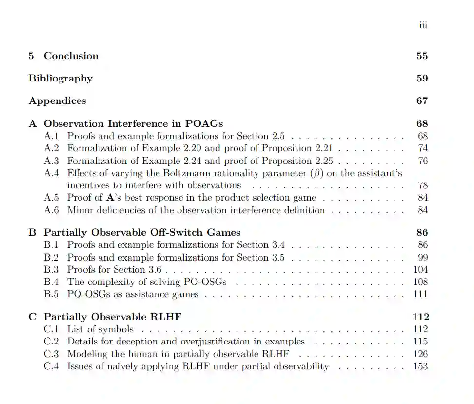 我们采用博弈论框架中的辅助博弈(assistance games)来研究人类与AI的对齐问题。过去关于辅助博弈的研究探讨了人类和AI助手都能完全观察环境的物理状态的情况。在此基础上,我们将研究推广到人类和助手可能只能部分观察环境的情况,并提出了部分可观察辅助博弈(POAG)。通过POAG框架,我们证明了关于AI助手的多种理论结果。我们首先考虑了观察干扰的问题,展示了三种可能导致最优AI助手干扰人类观察的因素。然后,我们重新审视了关于所谓**关闭开关问题(off-switch problem)**的过去保证,表明部分可观察性对设计能够自我关闭的AI助手提出了新的挑战。最后,我们分析了部分可观察性如何导致通过人类反馈进行强化学习——一种广泛应用于训练AI助手的算法——陷入欺骗性失败模式。我们最后讨论了将这些理论见解转化为改进有益AI助手技术的可能路径。