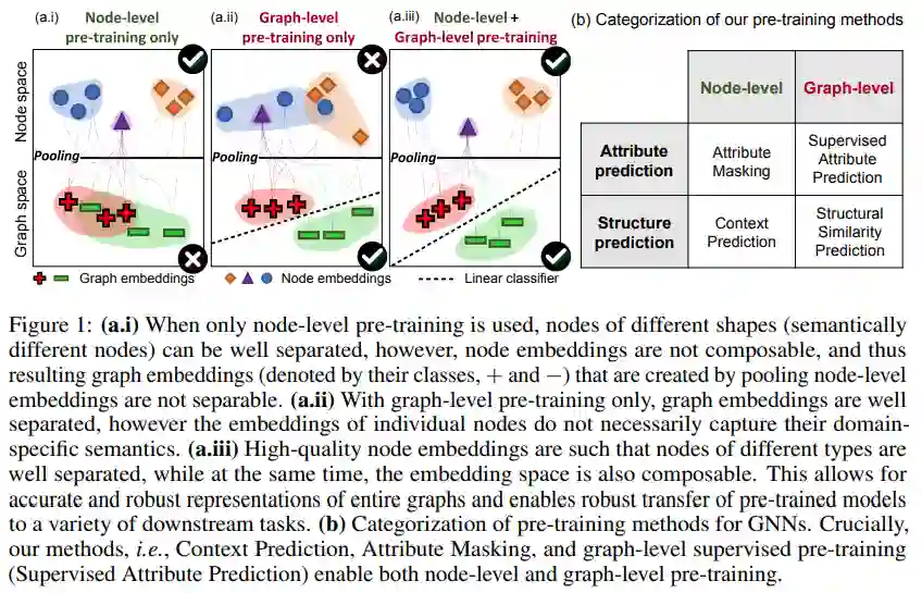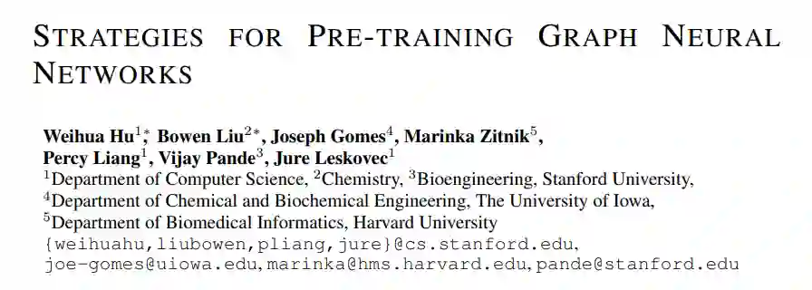 机器学习的许多应用都需要一个模型来对测试样本做出准确的预测,这些测试样本在分布上与训练示例不同,而在训练期间,特定于任务的标签很少。应对这一挑战的有效方法是,在数据丰富的相关任务上对模型进行预训练,然后在下游任务上对其进行微调。尽管预训练在许多语言和视觉领域都是有效的,但是如何在图数据集上有效地使用预训练仍是一个有待解决的问题。本文提出了一种新的图神经网络训练策略和自监督方法。我们的策略成功的关键是在单个节点以及整个图的层次上预训练一个具有强表示能力的GNN,以便GNN能够同时学习有用的局部和全局表示。我们系统地研究了多类图分类数据集的预处理问题。我们发现,在整个图或单个节点级别上对GNN进行预训练的朴素策略改进有限,甚至可能导致许多下游任务的负迁移。相比之下,我们的策略避免了负迁移,显著提高了下游任务的泛化能力,使得ROC-AUC相对于未经训练的模型提高了9.4%,实现了分子特性预测和蛋白质功能预测的最好性能。