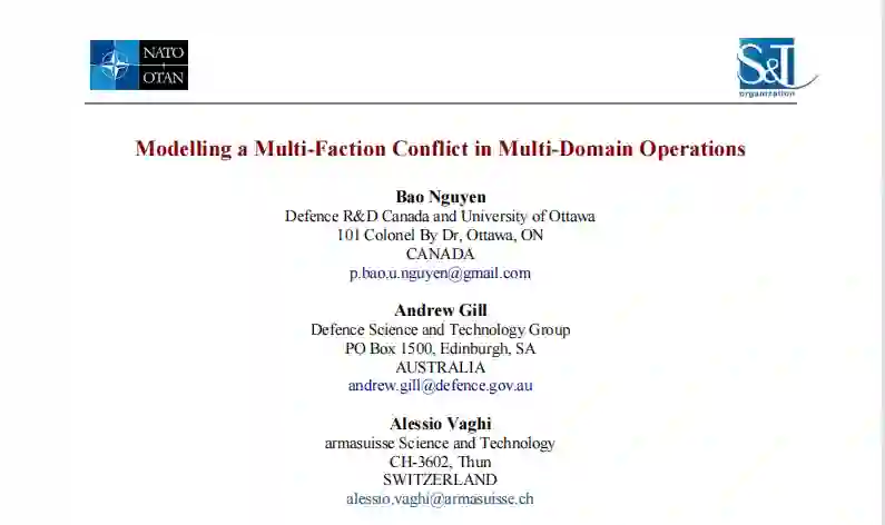 基于兰彻斯特方程的战斗模型描述了一支同质的蓝军对一支红军的战斗。然而,在现实中,冲突涉及在多个领域运作的多个阵营。我们提供了一个两方(蓝方和红方)各自可能有盟友(绿方等)的一般损耗模型。另外,如今的冲突不仅发生在物理领域,也发生在由新兴技术创造的领域。例如,网络战略也包括在内,反映了当今多域作战的复杂性。我们的模型是概率性的,即损耗率服从密度分布,并且是基于流行病模型的。它得出的指标包括冲突的持续时间和伤亡人数。因此,我们比较了两种情况:a)蓝军对红军;b)蓝军和绿军对红军。通过对参数空间的数据耕作(MSG-186)分析,我们确定了每一方的成功机会以及赢得冲突的条件。这使我们对涉及多因素的现代战争有了深入的了解,也许还能估计出多域作战的可能结果。