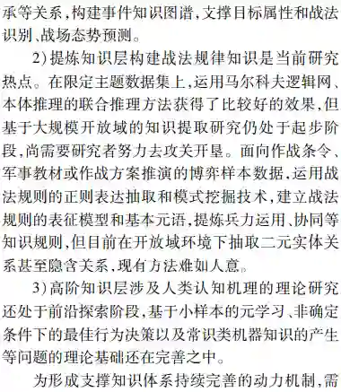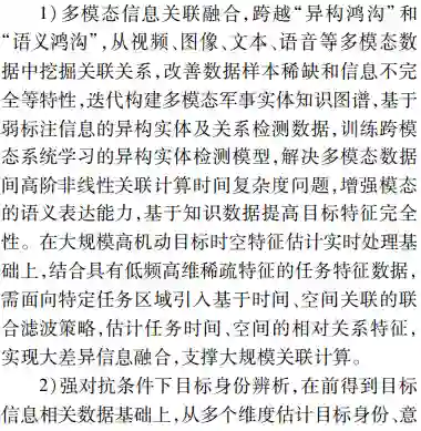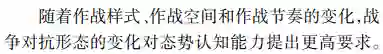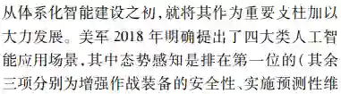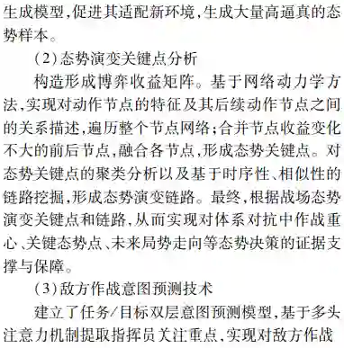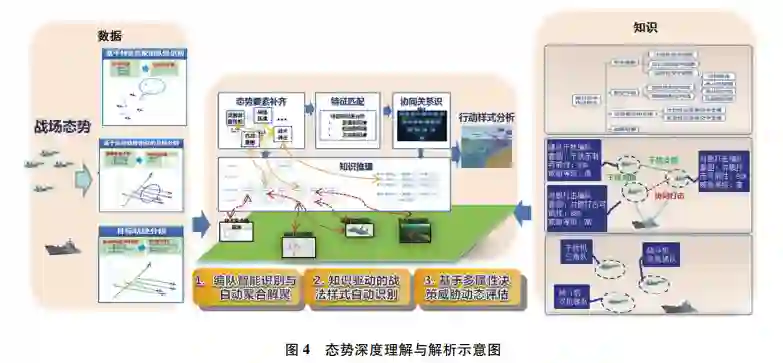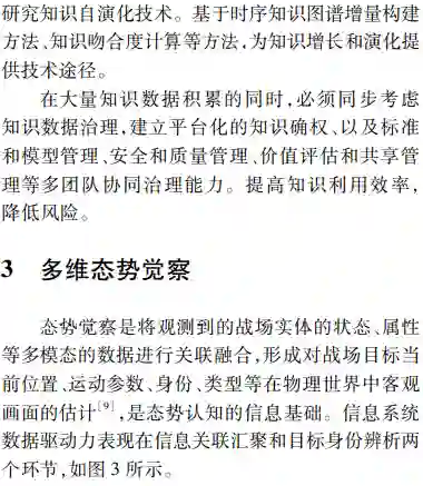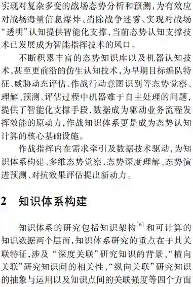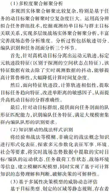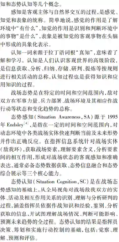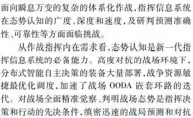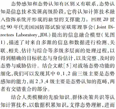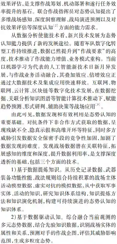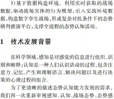 **首先由态势处理技术发展的历程,深入辨析了感知和认知技术内涵;然后面向实体、活动及相互作用关系的识别、理解与分析研判的能力需求,以体系对抗的视角提出了态势觉察、态势理解、态势预测和态势评估4个循环迭代的态势认知核心处理环节;**最后结合认知计算技术发展,分析了数据驱动下态势认知4个环节未来技术发展的脉络、重难要点,并给出了该领域技术路线选择的思考。