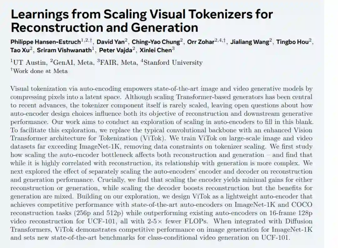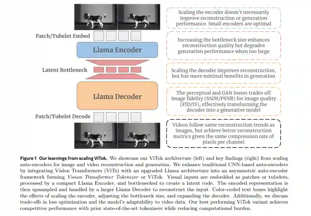 现代的高保真图像和视频生成方法(Brooks 等,2024;Polyak 等,2024;Genmo,2024;Esser 等,2024)依赖于两个组件:一个将像素编码到低维潜在空间并随后解码的视觉分词器,以及一个建模该潜在表示的生成器。尽管许多研究通过扩展基于Transformer的架构(Vaswani 等,2017;Dosovitskiy 等,2021)来改进生成器,但分词器本身,主要基于卷积神经网络(LeCun 等,1998)(CNNs),却很少成为扩展努力的重点。 本文研究了视觉分词器是否应当与生成器一样,进行同等的扩展工作。为实现这一目标,我们首先解决了两个主要瓶颈:架构限制和数据规模问题。首先,我们用基于Transformer的自编码器(Vaswani 等,2017)替换了卷积骨干网络,特别是采用了增强版的视觉Transformer(ViT)(Dosovitskiy 等,2021)架构,并结合了Llama(Touvron 等,2023),该架构在大规模训练中已显示出良好的效果(Gu 和 Dao,2023;Sun 等,2024)。我们得到的自编码器设计,称为视觉Transformer分词器(ViTok),可以与扩散Transformer(DiT)(Peebles 和 Xie,2023)的生成管道无缝结合。其次,我们在大规模、野外图像数据集上训练我们的模型,这些数据集大大超过了ImageNet-1K(Deng 等,2009),并将我们的方法扩展到视频,确保我们的分词器扩展不受数据限制。在这种设置下,我们研究了分词器扩展的三个方面: * 扩展自编码器瓶颈:瓶颈的大小与重建指标相关。然而,当瓶颈变得过大时,由于通道大小增加,生成性能会下降。 * 扩展编码器:尽管人们可能期望更深的编码器能够捕获更丰富的特征,但我们的研究发现,扩展编码器并未改善结果,甚至可能适得其反。特别地,更复杂的潜在表示可能更难解码和建模,导致整体性能下降。 * 扩展解码器:扩展解码器能提高重建质量,但对下游生成任务的影响仍不确定。我们假设解码器在一定程度上充当生成器的角色,根据有限的信息填充局部纹理。为了验证这一点,我们遍历了包括GAN(Goodfellow 等,2014)在内的不同损失函数,并观察到PSNR(测量与原始图像的保真度)与FID(衡量分布对齐但忽略一对一对应关系)之间存在权衡。