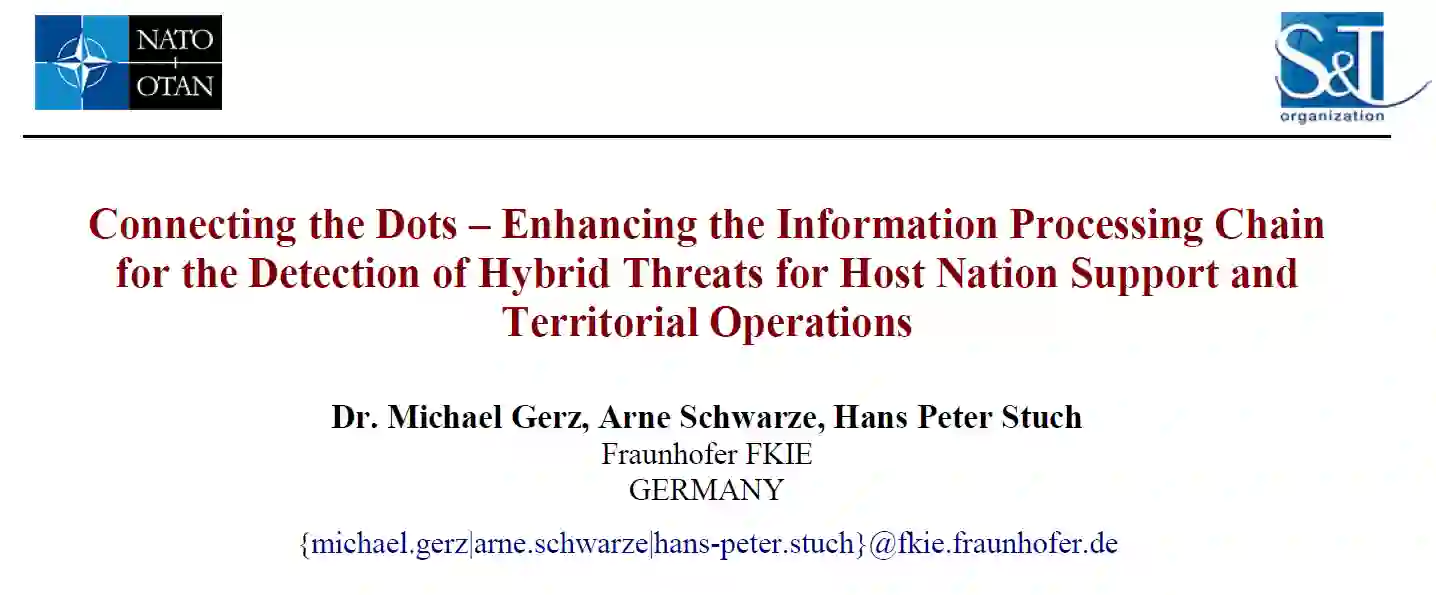 混合行动由多个行动领域的协调攻击完成,包括网络战和信息战。检测混合型威胁的一个关键挑战是如何识别个别事件是对手(精心策划的)措施的结果,并将所谓不相关的事件联系起来。由于物理和网络及信息领域的行动可能发生在不同的时间、不同的地点、不同的速度,作为短期或长期的活动,并且可能是低强度的,因此连接这些点的任务变得更加困难。为了确定与具体任务规划和执行相关的信息,混合威胁的风险评估必须始终在具体任务的背景下进行,包括其任务目标、行动区域和任务时间范围。