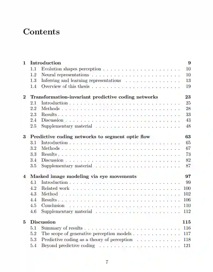 本论文研究了生物感知中生成式表示学习的计算机制,并探索了对经典预测编码(Predictive Coding, PC)模型的生物学可行性扩展。我们围绕表示学习、感官输入因果因素的解缠、与神经动态的一致性以及超越经典预测编码的生成任务变体,提出并探讨了四个关键研究问题。 第 2 章表明,时间统计信息可以作为 PC 网络的归纳偏置(inductive bias),从而实现对输入变换的鲁棒性。对连续输入序列的训练使网络表示中自发形成了层级时间尺度结构,与腹侧视觉通路中观察到的神经动态相一致。训练后的网络具备生成式图像重建能力,即使在遮挡条件下亦能表现出色。 第 3 章提出了一种新颖的 PC 架构,能够将由自我运动引起的视觉光流与外部原因所致的运动模式有效区分。该生物学上可行的模型融合了感知-运动失配电路(sensorimotor mismatch circuits),能够准确地将运动目标从背景中分离出来,其行为与小鼠钙成像实验数据高度一致。 在第 4 章中,我们提出了一种受眼动与灵长类动物中央凹视觉启发的自监督生成任务。基于图像遮蔽建模(masked image modeling)的概念验证模型显示,外围遮蔽可降低潜空间神经元之间的相关性,并在下游分类任务中相较于完整图像自编码方法表现出更优的性能。 综上所述,本研究结果强调了生成式神经网络不仅在图像处理任务中具有强大能力,同时也有潜力解释哺乳动物视觉皮层中的信息处理机制。