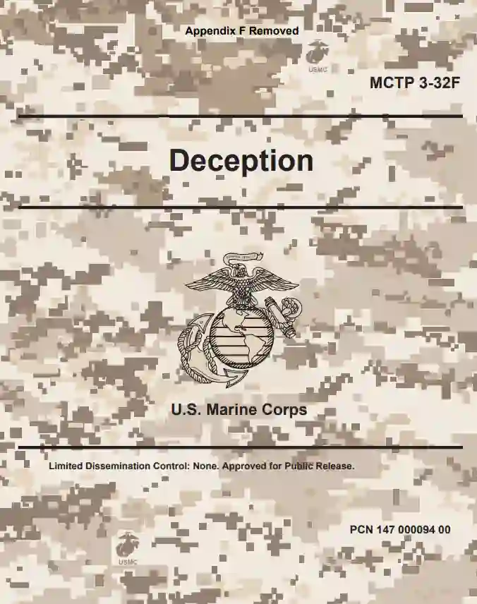 美海军陆战队战术出版物(MCTP)3-32F《欺骗》旨在协助海军陆战队规划、准备、执行和评估海军陆战队欺骗活动。它还旨在让部队了解欺骗作为在整个竞争过程中实现军事目标的一种手段的相关性和重要性。因此,本出版物适用于所有指挥层级的海军陆战队员和文职人员。它主要供战术层面(即海军陆战队远征军及以下部队)的指挥官和欺骗计划人员实际使用。本出版物简要介绍了欺骗理论和方法,概述了整个海军陆战队的职责,并将欺骗规划流程与海军陆战队规划流程相结合。与所有条令一样,虽然本出版物反映了当前的最佳实践,但应用时的考虑因素因情况、授权和可用资源而异。