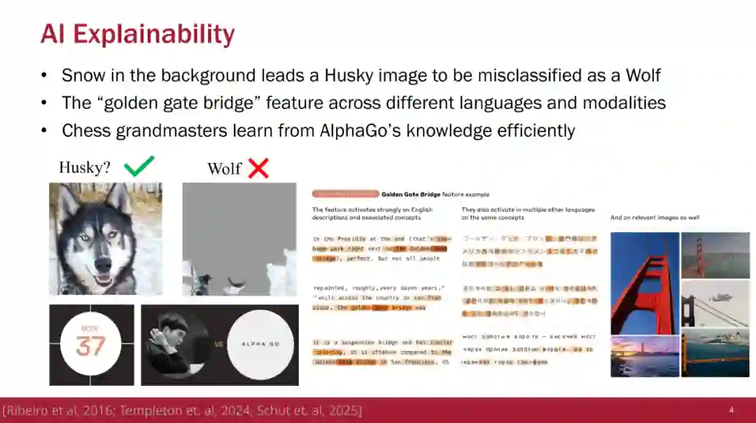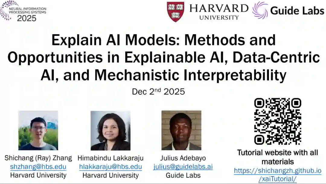 这三大方向的共同目标都是从不同维度更好地理解 AI 系统,它们之间的主要区别在于研究视角而非方法本身。 本教程首先介绍基本概念与历史背景,阐述可解释性为何重要,以及自早期以来该领域是如何演进的。第一部分技术深度解析将涵盖事后解释方法、数据中心解释技术、机制可解释性方法,并通过一个统一框架展示这些方法共享的基本技术,如扰动、梯度与局部线性近似等。 第二部分技术深度解析则聚焦于内生可解释模型(inherently interpretable models),并在可解释性的语境下澄清推理型(chain-of-thought)大语言模型与自解释型 LLM 的概念,同时介绍构建内生可解释 LLM 的相关技术。我们还将展示可使这些方法易于实践者使用的开源工具。 此外,我们强调了解释性研究中前景广阔的未来研究方向,以及其在更广泛的 AI 领域中所引发的趋势,包括模型编辑、模型操控(steering)与监管方面的应用。通过对算法、真实案例与实践指南的全面覆盖,参与者将不仅获得对最先进方法的深刻技术理解,还将掌握在实际 AI 应用中有效使用可解释性技术的实践技能。