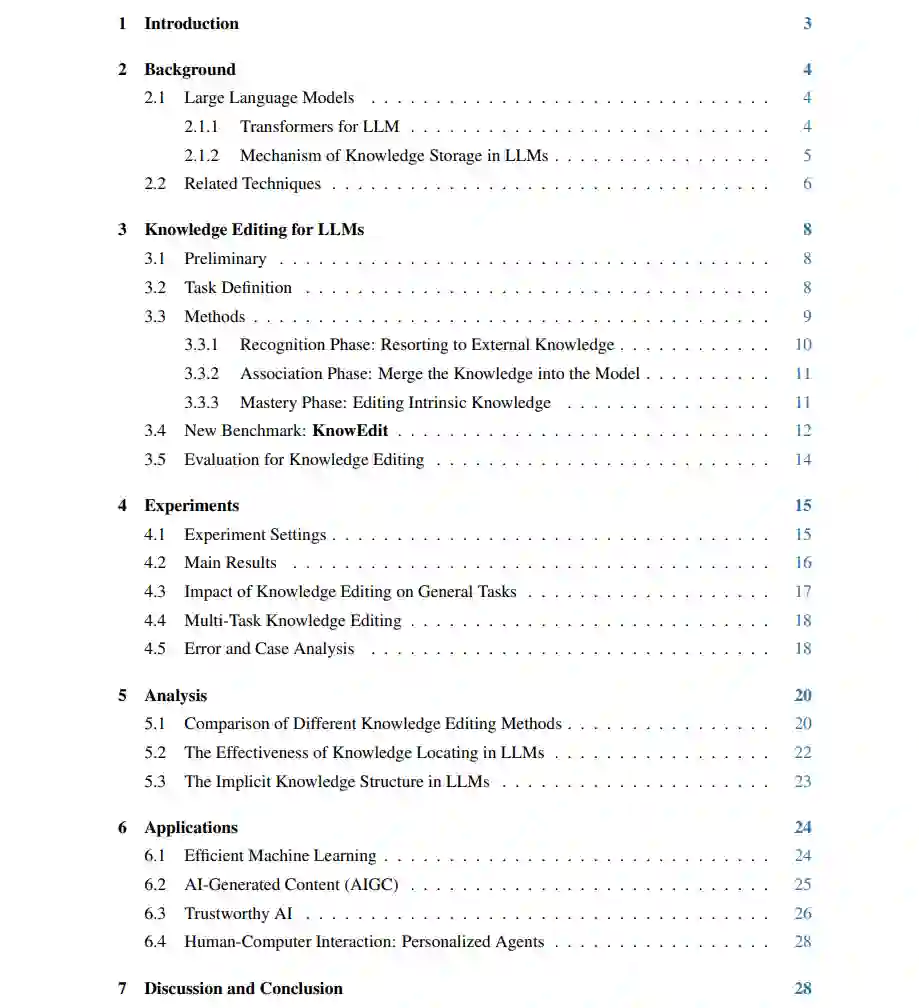 知识编辑对LLMs的初步内容 通过对各种数据集的大量训练,LLMs积累了丰富的事实和常识信息,使这些模型成为虚拟知识存储库[47, 141]。这个丰富的知识库已经在各种下游任务中得到有效利用,如许多研究所证明的那样[142]。此外,王等人[143]已经展示了LLMs在自主构建高质量知识图的潜力,无需人类监督。尽管LLMs在其当前状态下作为新兴知识库表现出了潜力,但它们也存在一定的局限性。这些不足在实际应用中常表现为输出的不准确或错误。理想的知识库不仅应存储大量信息,还应允许进行高效和有针对性的更新,以纠正这些错误并提高其准确性。认识到这一差距,我们的论文引入了知识编辑的概念,旨在实现对LLMs的快速和精确修改,使它们能够生成更准确和相关的输出。通过实施对LLMs的知识编辑,我们旨在提高LLMs的效用,使它们更接近成为普遍可靠和适应性强的知识存储库的理想目标。这一进展有望解决LLMs目前的缺陷,并释放它们作为动态和准确知识库的全部潜力,以供应用使用。