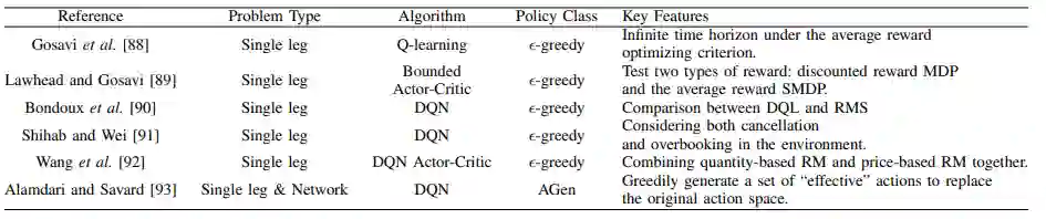 传统的和广泛使用的ARM系统的方法是基于模型和数据驱动的,这在很大程度上取决于预测数据的准确性,如乘客到达分布、支付意愿(WTP)和取消率。最近,研究人员一直在考虑在ARM上应用无模型的学习方法,如最优控制理论或RL。在ARM中使用RL的研究方向始于2002年[88],其中λ-smart算法被设计为在平均奖励优化准则下,将单腿ARM问题作为无限时间范围的半马尔科夫决策问题(SMDP)。后来,在同一问题上应用了有界行为人批评法[89]。这两项研究都声称,该模型的性能优于EMSR模型。已经引入了ARM上的DRL模型,将领域知识与在图形处理单元(GPU)上训练的DNN结合起来[90]。一个DRL模型也被应用于库存控制问题,使用DQN并考虑其环境中的取消和超额预订[91]。近年来还出现了一些其他对DRL模型的改进。例如,通过结合基于数量的RM和基于价格的RM研究了一个ARM问题[92],而DRL被应用于单腿和网络腿问题[93]。