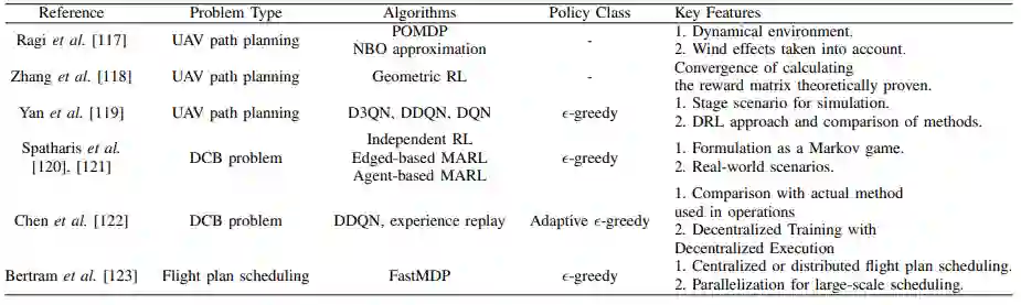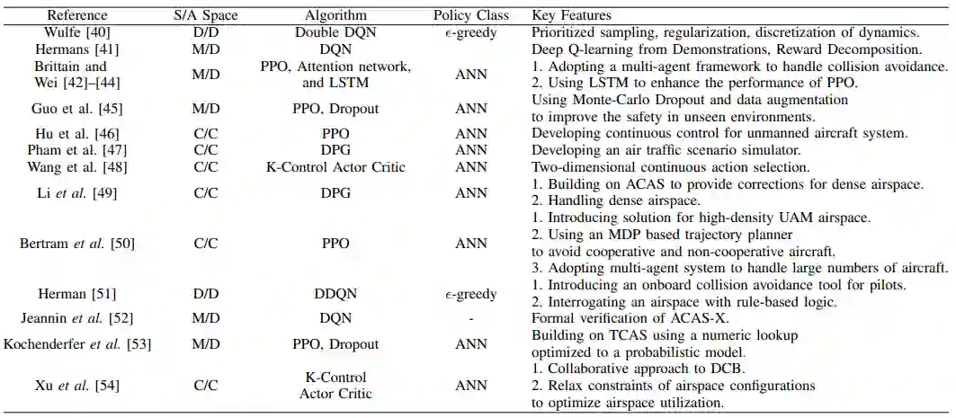 在许多具有挑战性的问题上表现出超越人类水平的性能,无人驾驶飞行器(UAV)的防撞问题已经通过实施DQN算法得到了解决[40]。在[41]中,实施了来自演示的深度Q-Learning(DQfD)和奖励分解来提供可解释的飞机防撞解决方案。DQN技术也被应用于无人机的防撞[40],在NASA的33区改变路线和速度[55],在现有防撞方法的基础上计算修正[51],[53],以及在密集空域的无人自由飞行交通[49]。[56]中提出了一个使用RL和GPS航点来避免碰撞的框架。在[57]中,应用了一个双深Q网络(DDQN)来引导飞机通过终端区域而不发生碰撞。该方法解决了传统防撞方法失败的情况,即在密集的空域中,那些预计被无人机占据的空域,并证明了提供合理修正的能力,以保持飞机系统之间的足够安全。