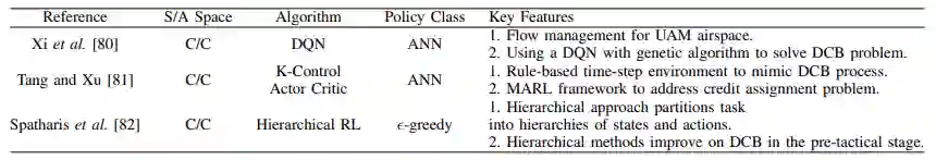 空中交通流量和管理(ATFM)是交通管理的一个子集,重点是确保可用的空域容量得到有效利用。容量不仅受航段大小、形状或高度的影响,而且还受风、天气和紧急情况等随机变量或机场容量和吞吐量等更多恒定变量的影响。需求能力平衡(DCB)是一种预测方法,以确保空域或地面业务的有效运行。协作方法被引入到DCB中,利用:分配延误,允许替代轨迹,使用固定的空域划分,或调整空域划分来有效管理空域[54]。与其他解决方案不同的是,同步协作-需求容量平衡(SC-DCB)寻求放松空域配置的约束,其结果表明,减少有效扇区,从而更好地利用有效扇区。在最近的工作中[80],RL技术被用来检查其在UAM流量管理中的效率,使用的状态空间包括从飞机、天气、空域容量和交通密度监测中检索的数据,以及通过Post-Hoc系统构建的训练数据。流量管理中的多智能体法也出现了[81]-[83],证明了MARL方法可以在交通密集区(热点)通过采取滞留、离开或合作行动成功解决这些热点问题。该方法也导致了整体延迟的减少。