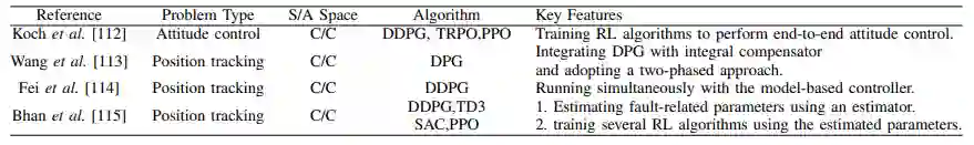 无模型的基于RL的FTC方法的一个重要缺点是不能保证收敛性。为了克服这个问题,有人提出了一个基于模型的八旋翼飞机位置跟踪框架[115]。提出了四种RL算法,即PPO、DDPG、Twin-Delayed DDPG(TD3)和soft actor-critic(SAC)。结果表明,PPO更适用于容错任务。