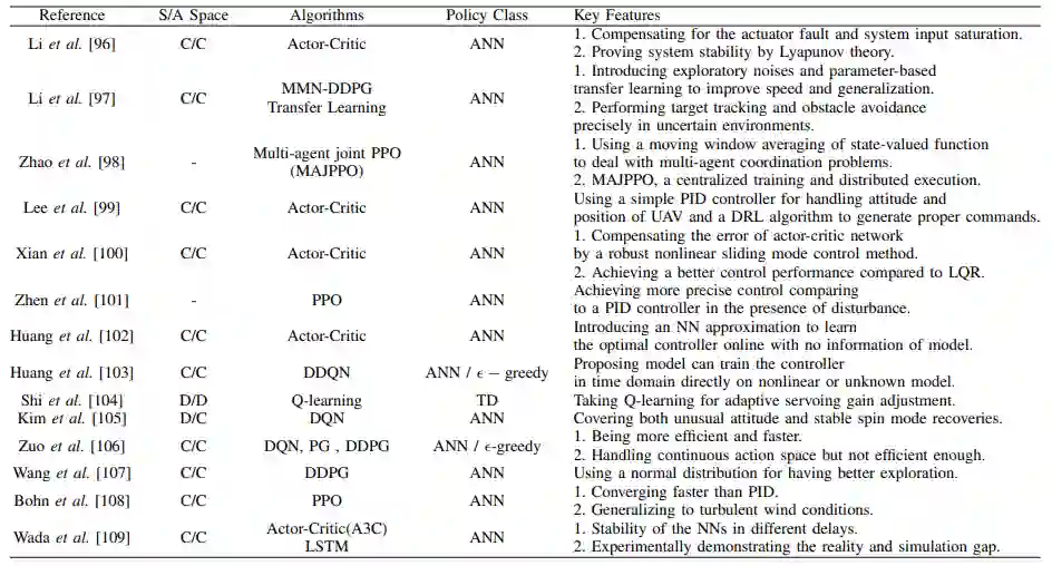 在[103]中,表明直接通过RL训练控制器,基于非线性或未知模型,是可行的。在[106]中还比较了基于不同RL算法的控制器的性能。结果显示,DQN比策略梯度或DDPG更适合于离散任务,而DDPG在更复杂的任务中表现更好。另外,DQN方法被用来设计飞机的姿态控制系统[103], [106]. 此外,基于DDPG的控制器在[97]、[106]、[107]、[110]、[111]中建立。一个改进的DDPG方法与转移学习相结合,开发了一个控制系统来进行自主机动目标跟踪[97]。还研究了一个基于DDPG的控制器,引导无人机从任何位置和姿态到水平面的固定位置[110]。