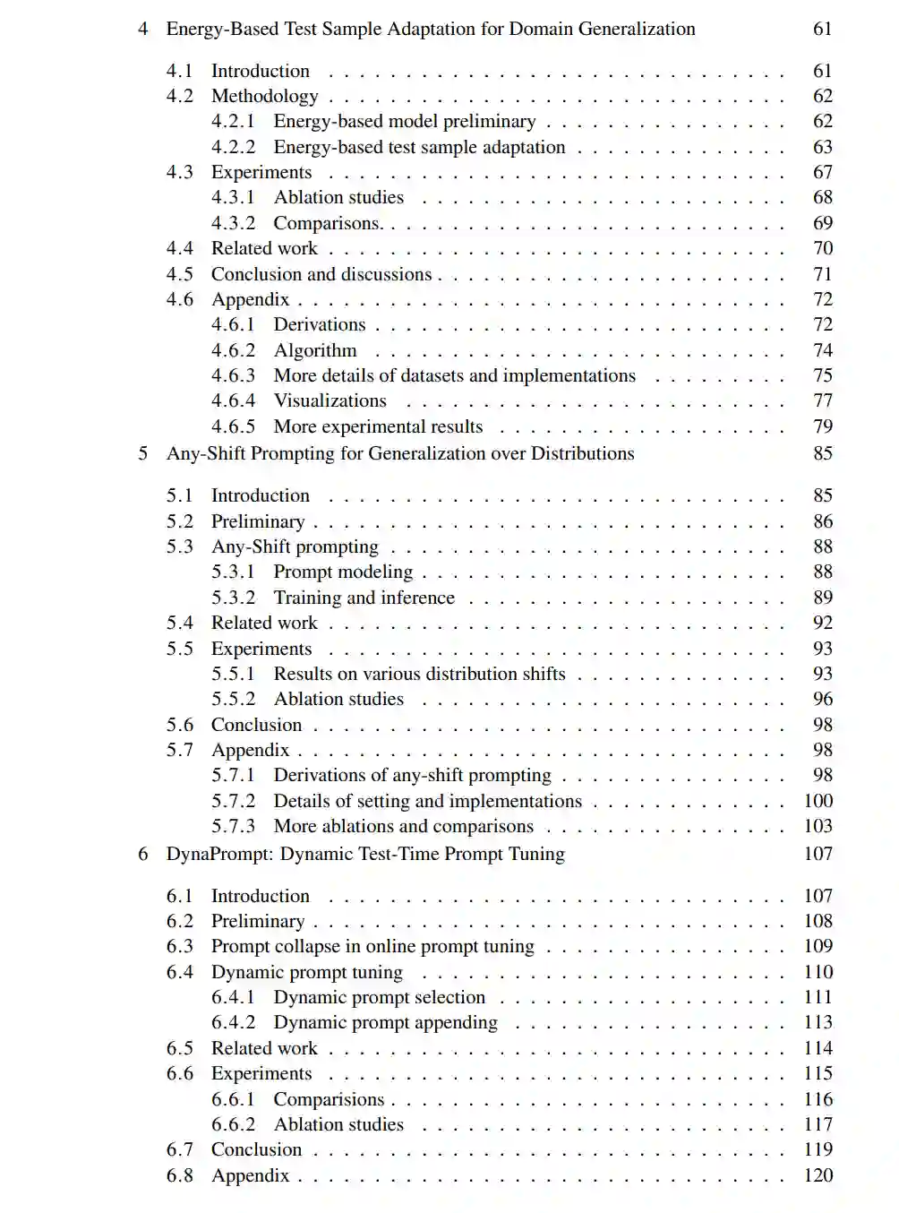 泛化能力是将已学到的知识从已见的上下文有效应用到不熟悉的情况中的能力,它是人类智能的标志,但对于当前的人工智能系统来说,仍然是一个重大挑战。机器学习算法通常依赖于训练数据和测试数据共享相同分布的假设。因此,当面对分布变化时,它们会表现出显著的性能下降。本论文解决了提升泛化能力的关键问题,特别是在测试时增强泛化能力,而在训练过程中无法访问测试数据。论文的结构如下:1) 通过贝叶斯神经网络的不可变学习,在训练时进行广义模型学习;2) 通过元学习和变分推理技术,在测试时直接调整模型以适应个别测试样本,而不依赖于标签和额外的测试信息;3) 通过能量基模型,将测试样本适应到训练分布,在测试时进行广义样本学习,避免模型调整和灾难性遗忘;4) 通过创新的提示学习框架,在测试时为多模态基础模型进行广义提示学习,包括在任何分布变化下生成特定测试任务的提示,并进行动态测试时提示调优,以实现在线提示更新。每一章都介绍了创新的方法,详细的理论和实验结果,提出了一种全面的方法来提高测试时的泛化能力。最后,我们进一步探讨了过去和未来的测试时泛化,并提供了一个关于测试时适应性的全面系统性回顾,总结了测试时泛化的进展,并展望未来的发展方向。