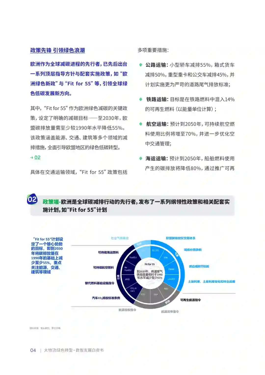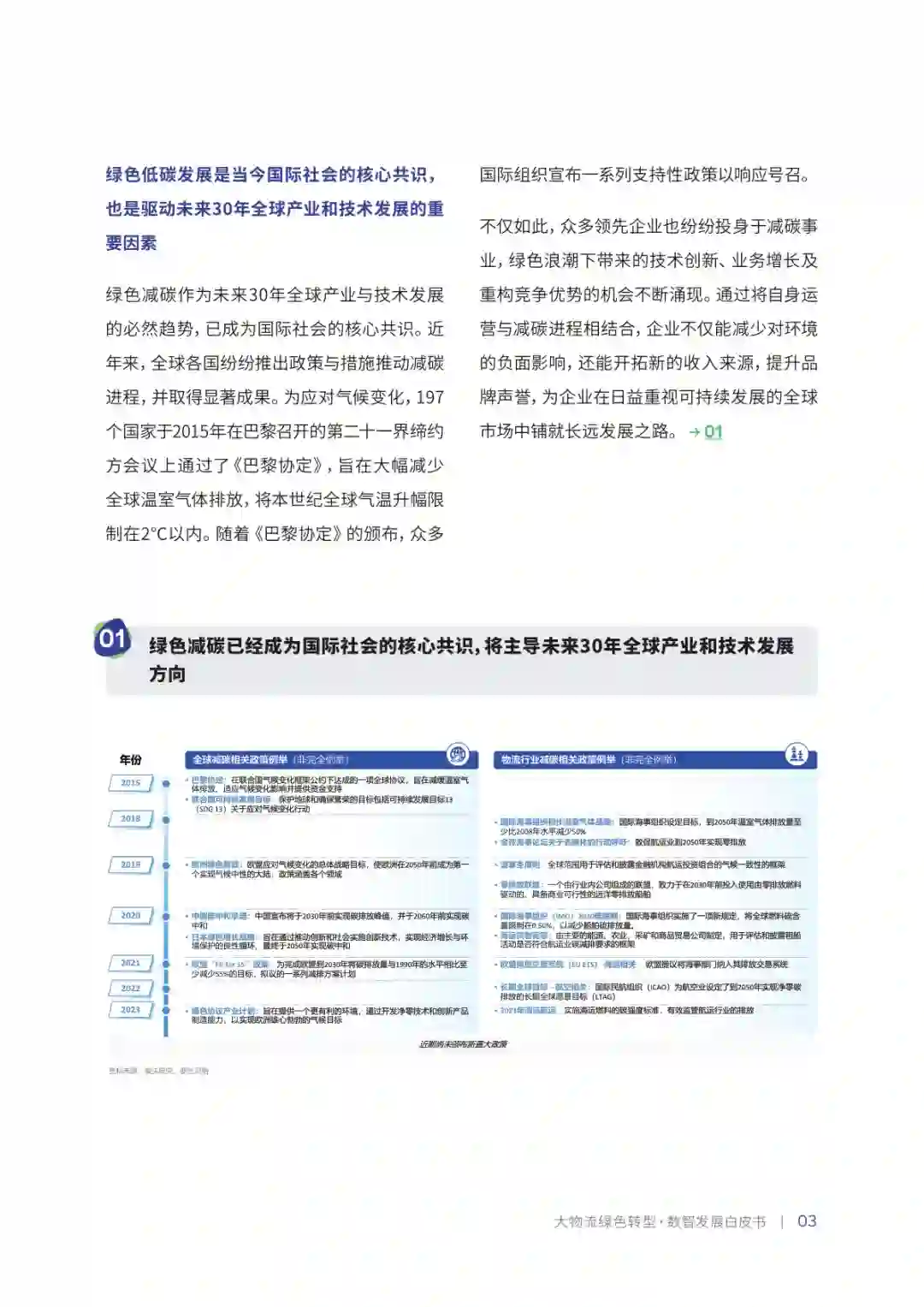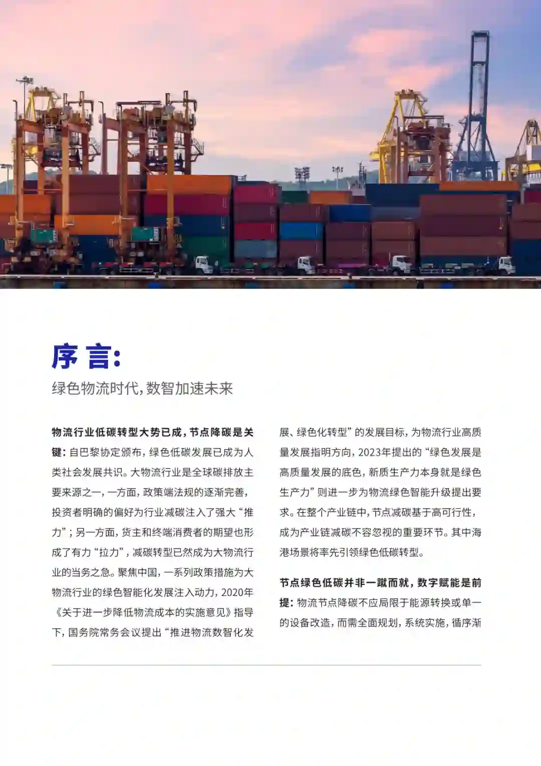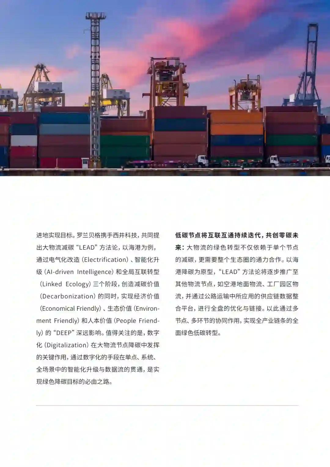 绿色物流时代,数智加速未来 物流行业低碳转型大势已成,绿色低碳发展已成为人类社会发展共识。大物流行业是全球碳排放主要来源之一,一方面,政策端法规的逐渐完善,投资者明确的偏好为行业减碳注入了强大“推力”;另一方面,货主和终端消费者的期望也形成了有力“拉力”,减碳转型已然成为大物流行业的当务之急。聚焦中国,一系列政策措施为大物流行业的绿色智能化发展注入动力,2020年《关于进一步降低物流成本的实施意见》指导下,国务院常务会议提出“推进物流数智化发展、绿色化转型”的发展目标,为物流行业高质量发展指明方向,2023年提出的“绿色发展是高质量发展的底色,新质生产力本身就是绿色生产力”则进一步为物流绿色智能升级提出要求。在整个产业链中,节点减碳基于高可行性成为产业链减碳不容忽视的重要环节。其中海港场景将率先引领绿色低碳转型。 节点绿色低碳并非一蹴而就,数字赋能是前提:物流节点降碳不应局限于能源转换或单一的设备改造,而需全面规划,系统实施,循序渐进地实现目标。罗兰贝格携手西井科技,共同提出大物流减碳“LEAD”方法论,以海港为例,通过电气化改造(Electrification)、智能化升级(Al-driven Intelligence) 和全局互联转型(Linked Ecology)三个阶段,创造减碳价值(Decarbonization)的同时,实现经济价值(Economical Friendly)、生态价值(Environ.ment Friendly)和人本价值(People Friendly)的“DEEP"深远影响。值得关注的是,数字化 (Digitalization)在大物流节点降碳中发挥的关键作用,通过数字化的手段在单点、系统、全场景中的智能化升级与数据流的贯通,是实现绿色降碳目标的必由之路。 低碳节点将互联互通持续迭代,共创零碳未来:大物流的绿色转型不仅依赖于单个节点的减碳,更需要整个生态圈的通力合作。以海港降碳为原型,“LEAD”方法论将逐步推广至其他物流节点,如空港地面物流、工厂园区物流,并通过公路运输中所应用的供应链数据整合平台,进行全盘的优化与链接。以此通过多节点、多环节的协同作用,实现全产业链条的全面绿色低碳转型。