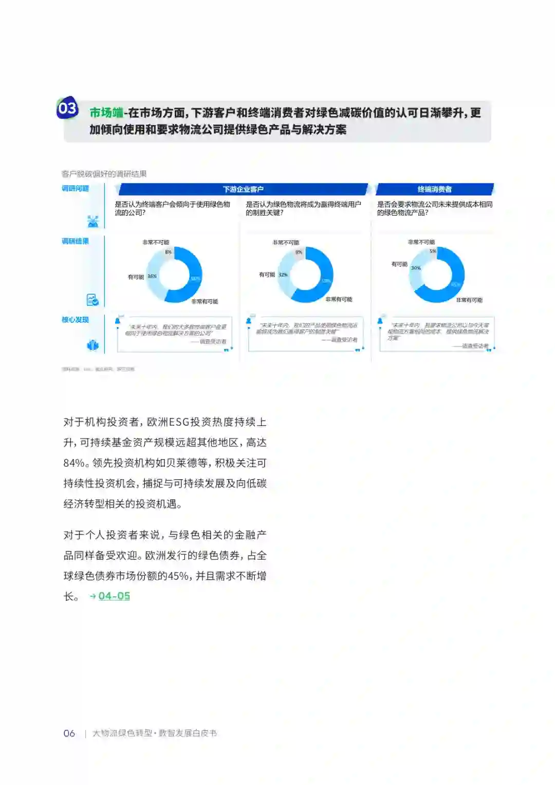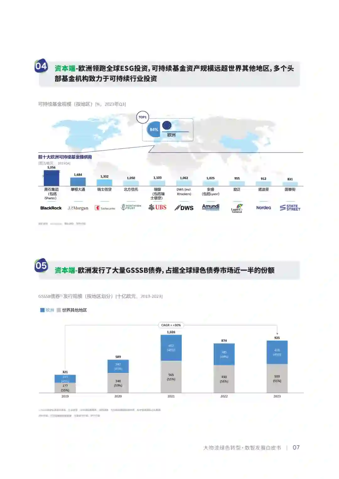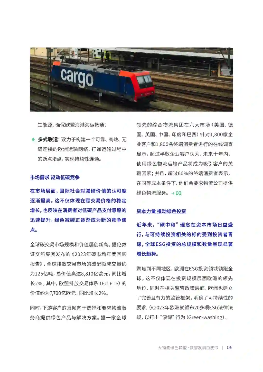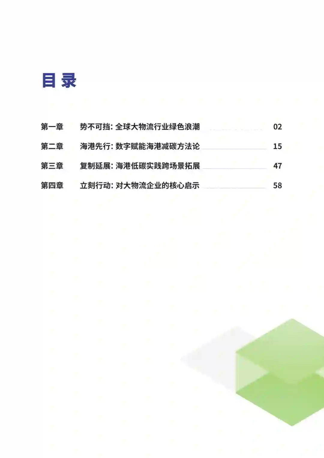 绿色物流时代,数智加速未来 物流行业低碳转型大势已成,绿色低碳发展已成为人类社会发展共识。大物流行业是全球碳排放主要来源之一,一方面,政策端法规的逐渐完善,投资者明确的偏好为行业减碳注入了强大“推力”;另一方面,货主和终端消费者的期望也形成了有力“拉力”,减碳转型已然成为大物流行业的当务之急。聚焦中国,一系列政策措施为大物流行业的绿色智能化发展注入动力,2020年《关于进一步降低物流成本的实施意见》指导下,国务院常务会议提出“推进物流数智化发展、绿色化转型”的发展目标,为物流行业高质量发展指明方向,2023年提出的“绿色发展是高质量发展的底色,新质生产力本身就是绿色生产力”则进一步为物流绿色智能升级提出要求。在整个产业链中,节点减碳基于高可行性成为产业链减碳不容忽视的重要环节。其中海港场景将率先引领绿色低碳转型。 节点绿色低碳并非一蹴而就,数字赋能是前提:物流节点降碳不应局限于能源转换或单一的设备改造,而需全面规划,系统实施,循序渐进地实现目标。罗兰贝格携手西井科技,共同提出大物流减碳“LEAD”方法论,以海港为例,通过电气化改造(Electrification)、智能化升级(Al-driven Intelligence) 和全局互联转型(Linked Ecology)三个阶段,创造减碳价值(Decarbonization)的同时,实现经济价值(Economical Friendly)、生态价值(Environ.ment Friendly)和人本价值(People Friendly)的“DEEP"深远影响。值得关注的是,数字化 (Digitalization)在大物流节点降碳中发挥的关键作用,通过数字化的手段在单点、系统、全场景中的智能化升级与数据流的贯通,是实现绿色降碳目标的必由之路。 低碳节点将互联互通持续迭代,共创零碳未来:大物流的绿色转型不仅依赖于单个节点的减碳,更需要整个生态圈的通力合作。以海港降碳为原型,“LEAD”方法论将逐步推广至其他物流节点,如空港地面物流、工厂园区物流,并通过公路运输中所应用的供应链数据整合平台,进行全盘的优化与链接。以此通过多节点、多环节的协同作用,实现全产业链条的全面绿色低碳转型。