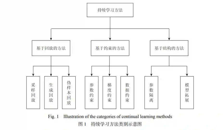 随着深度学习技术的发展与应用,特别是资源受限场景和数据安全场景对序列任务和数据进行快速学习需求的增多,持续学习逐渐成为机器学习领域关注的一个新热点. 不同于人类所具备的持续学习和迁移知识的能力,现有深度学习模型在序列学习过程中容易遭受灾难性遗忘的问题. 因此,如何在动态、非平稳的序列任务及流式数据中不断学习新知识、同时保留旧知识是持续学习研究的核心. 首先,通过对近年来持续学习国内外相关工作的调研与总结,将持续学习方法分为基于回放、基于约束、基于结构3大类,并对这3类方法做进一步的细分. 具体而言,根据所使用的样本来源将基于回放的方法细分为采样回放、生成回放、伪样本回放3类;根据训练约束的来源将基于约束的方法细分为参数约束、梯度约束、数据约束3类;根据对于模型结构的使用方式将基于结构的方法细分为参数隔离、模型拓展2类. 通过对比相关工作的创新点,对各类方法的优缺点进行总结. 其次,对国内外研究现状进行分析. 最后,针对持续学习与其他领域相结合的未来发展方向进行展望.