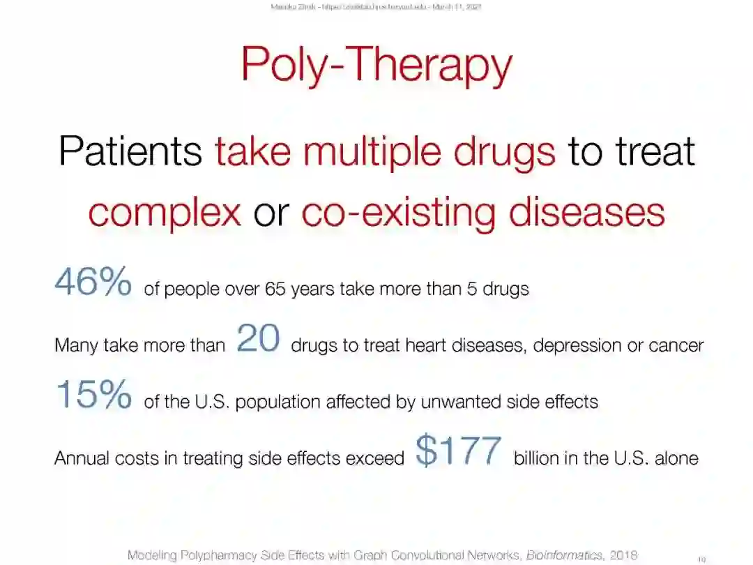 我们很高兴地邀请到来自哈佛大学的Marinka Zitnik教授来给我们做一个关于计算生物学中的图神经网络的讲座。在本讲座中,Marinka教授概述了为什么图学习技术可以极大地帮助计算生物学研究。具体来说,本演讲涵盖了3个范例用例: (1) 通过异构知识图谱的多关系链接预测发现安全的药物-药物组合;(2)通过学习子图嵌入对患者结局和疾病进行分类;(3)通过图的少样本学习,学习有效的疾病治疗方法。