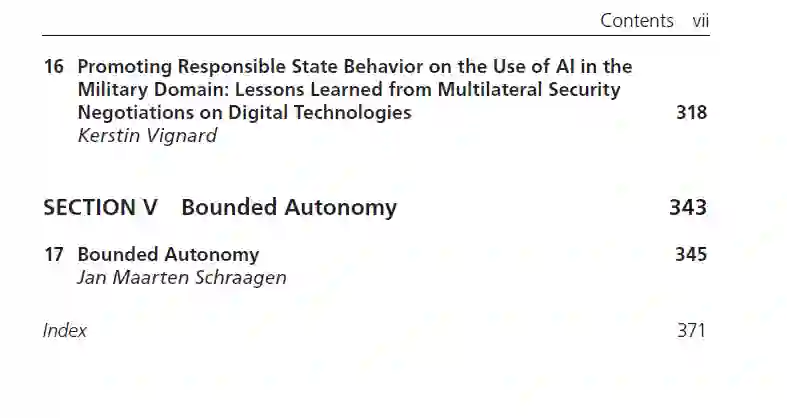本书为读者提供了涉及军事系统中负责任开发、部署和使用AI的所有相关方面的广泛概述。它强调了AI的优势以及将AI纳入军事系统的潜在缺点。