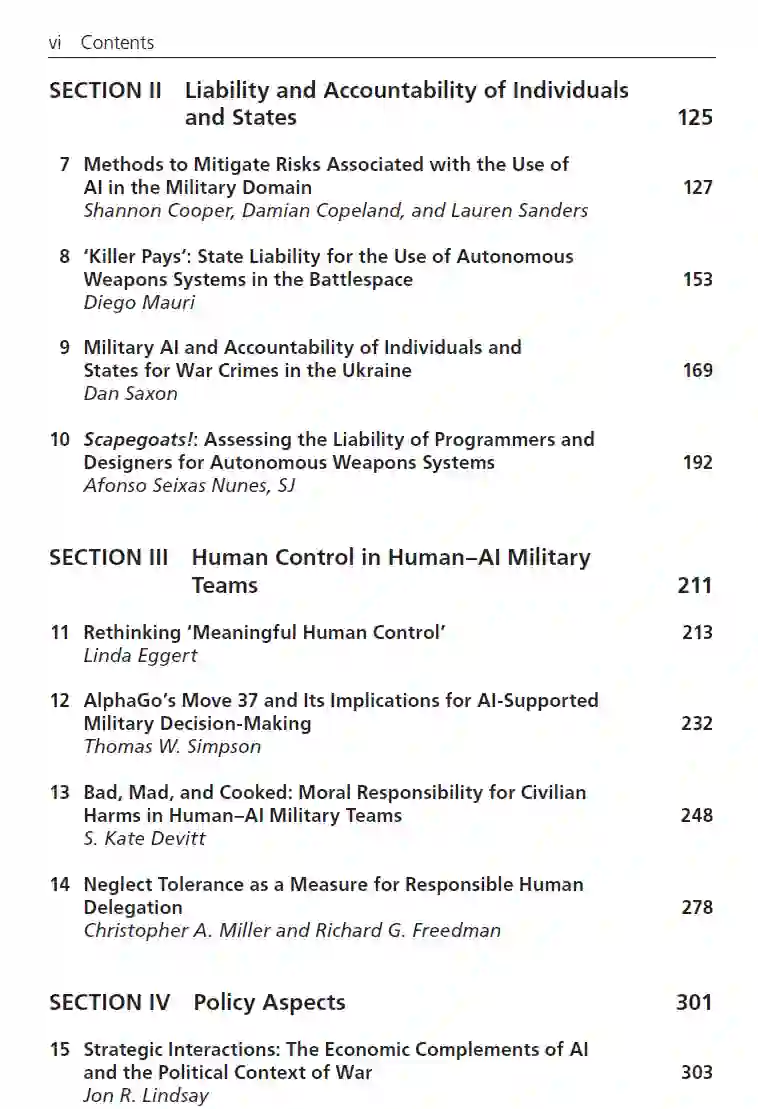 《AI在军事系统中的负责任使用》阐述了在军事系统中开发和使用AI的负责任方式所需的要求。本书讨论了当前在普遍应用于军事系统(不仅仅是武器系统)的负责任AI领域的发展。该书采用广泛的跨学科视角,包括哲学、法律、人因、人工智能、系统工程和政策制定等领域的贡献。 全书分为五个部分,第一部分涵盖了实施军用AI负责任的各种实用模型和方法;第二部分聚焦于个人和国家的责任与问责;第三部分处理人类在人工智能军事团队中的控制问题;第四部分讨论诸如多边安全谈判之类的政策方面;第五部分专注于武器系统中的‘自主性’和‘有意义的人类控制’。 主要特点: