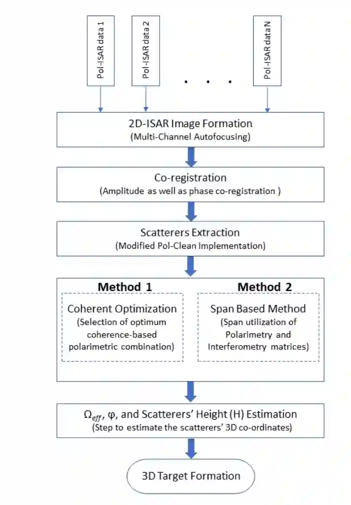 图2.1:使用基于Pol-InISAR拟议方法的3-D目标形成步骤的一般方框图。