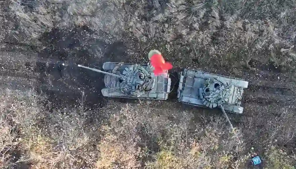 图:2023 年末,乌克兰军队第 30 机械化旅的一架武装四旋翼无人机向一辆试图对乌克兰东部巴赫穆特以北的乌克兰阵地进行袭击并逃跑的俄罗斯坦克投掷了一枚红色手榴弹。(第 30 机械化旅截图,via X)