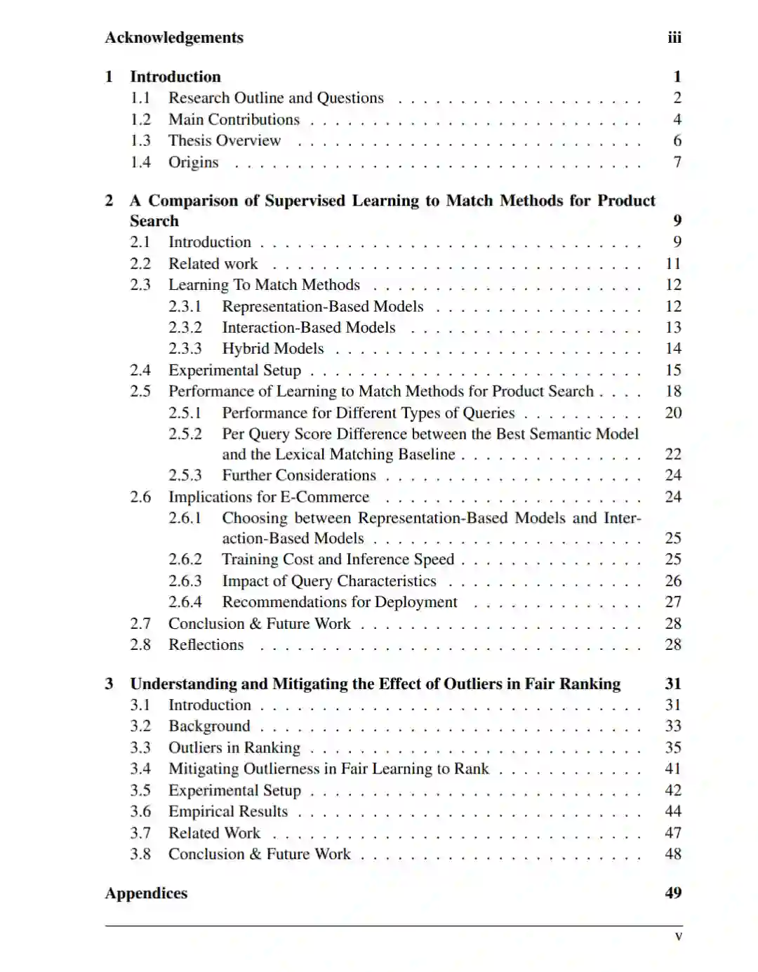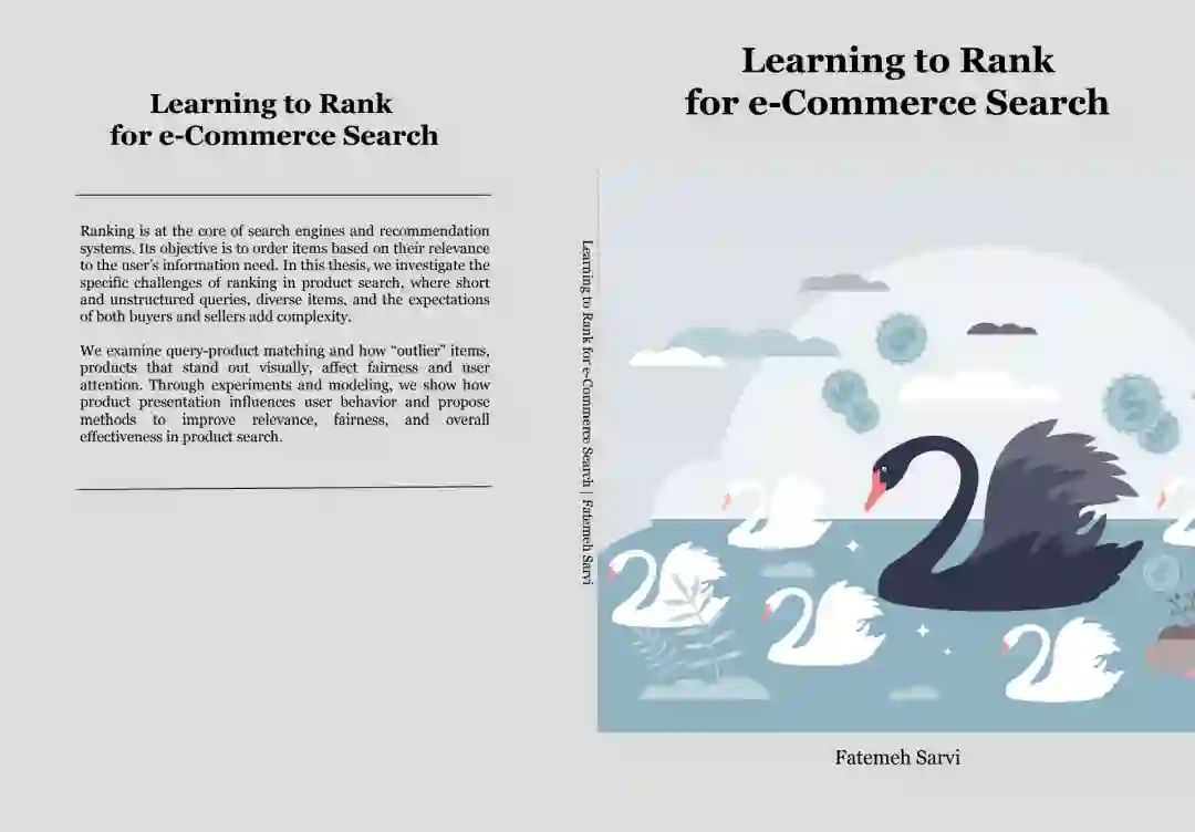 本论文研究了在商品搜索(product search)中应用排序学习(learning-to-rank)模型所面临的挑战。已有研究表明,由于查询与商品描述通常具有有限且非结构化的特点,商品搜索中的词汇鸿沟(vocabulary gap)更为突出。因此,我们首先聚焦于基于文本数据的查询–商品匹配问题。我们对当前最先进的监督式学习匹配(learning-to-match)模型进行了系统评估,并比较了它们在商品搜索任务中的表现。研究结果识别出了在准确性与效率之间取得良好平衡的模型,为实践者提供了具有实用价值的洞见。 接下来,我们探讨了双边平台(two-sided platforms)中的排序公平性问题,其目标是同时满足两类商品搜索用户:消费者与商家。由于准确的曝光估计对于实现该平衡至关重要,我们提出了排序中“离群性”(outlierness)这一现象,作为影响基于曝光的公平排序算法的关键因素。离群项是指那些由于呈现特征(presentational features)独特而在列表中偏离其他商品的产品。我们通过实证研究显示,这类商品会吸引更多注意力,并可能影响排序中的曝光分布。为缓解这一影响,我们提出了一种降低离群性的方式,该方法在不损害用户效用或公平性的前提下实现了更稳定的排名。此外,我们提出“离群偏差”(outlier bias)这一新的点击偏差类型,并进一步提出了一种同时建模离群偏差与位置偏差(position bias)的离群感知点击模型(outlier-aware click model)。 最后,我们研究了不同呈现特征如何影响用户对离群项的注意力与感知。我们识别了用户的扫描模式(scanning patterns),并确定了自下而上(bottom-up)与自上而下(top-down)因素在引导注意力与塑造离群项感知过程中所起的作用。